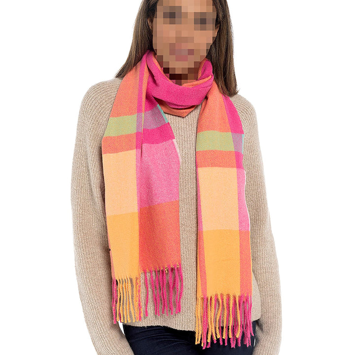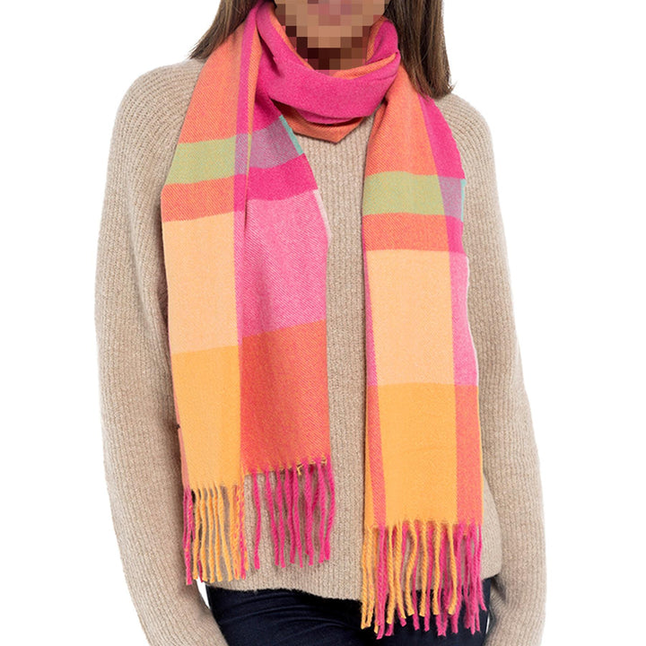 STYLISH CHECKERED PATTERN: Featuring a vibrant orange and pink checkered pattern, this scarf is a stylish statement piece that complements any fall and winter wardrobe. Easy to pair with coats, sweaters, and dresses.