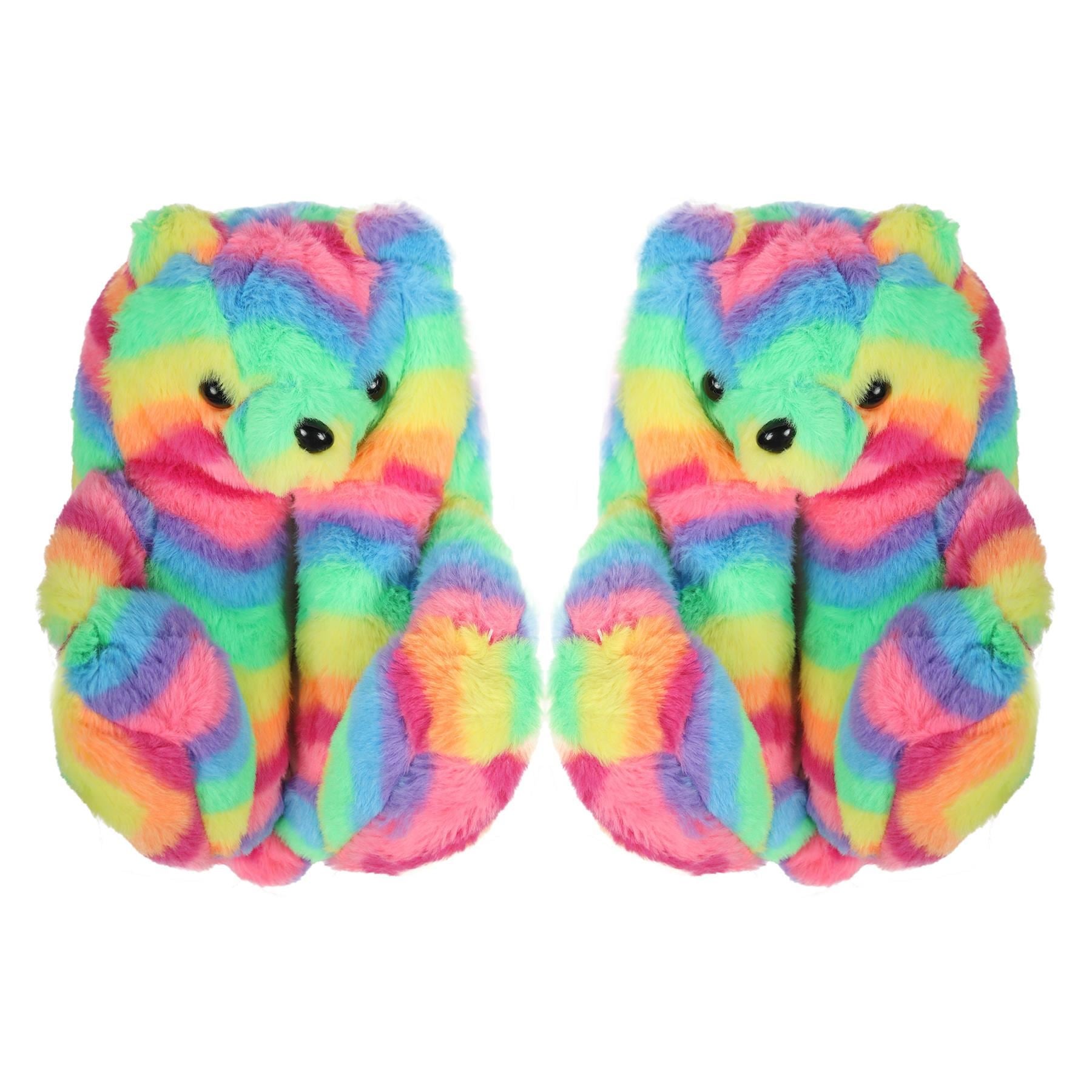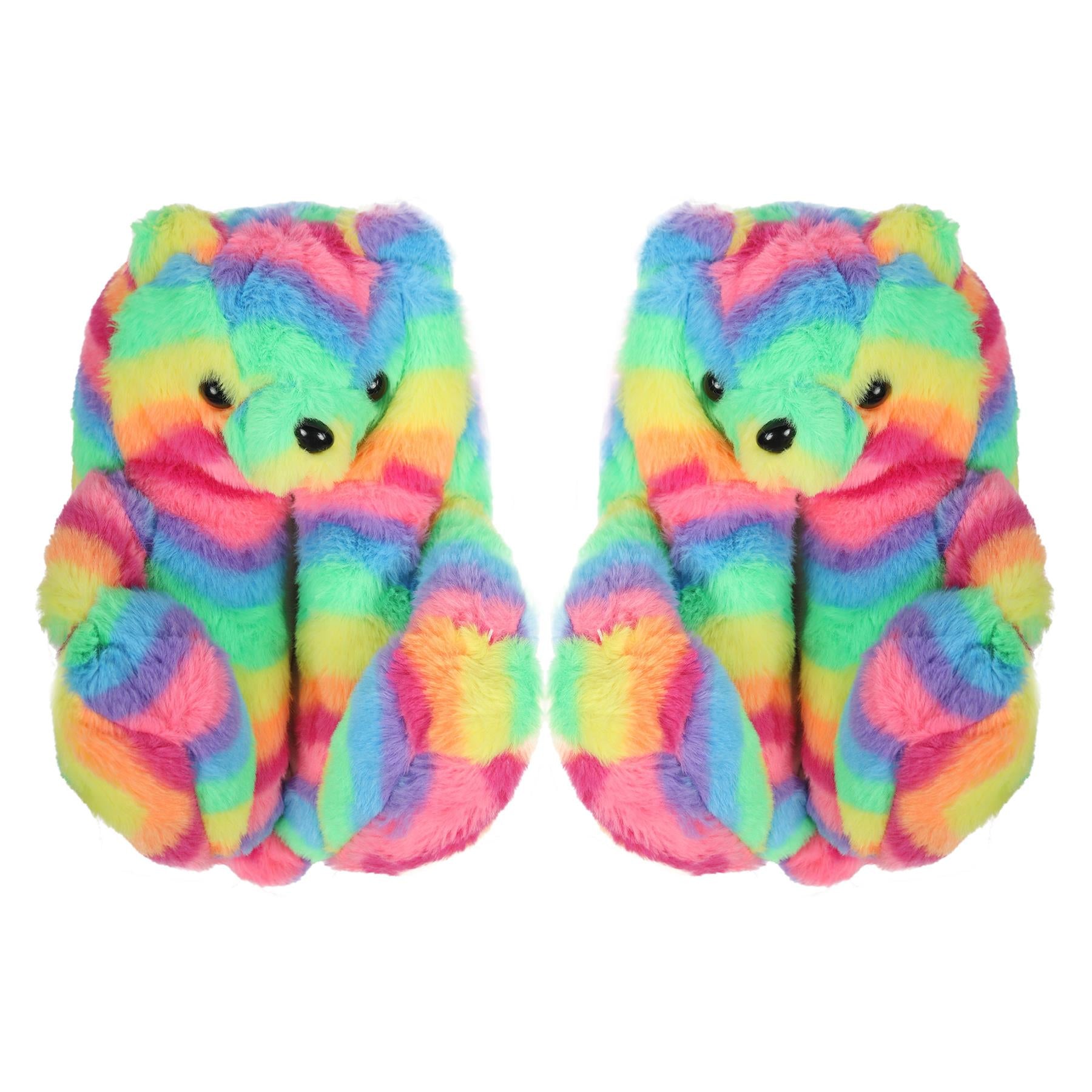 Kids Girls Womens 3D Rainbow Bear Slippers Cute Animal Face Soft Plush Warm Shoe