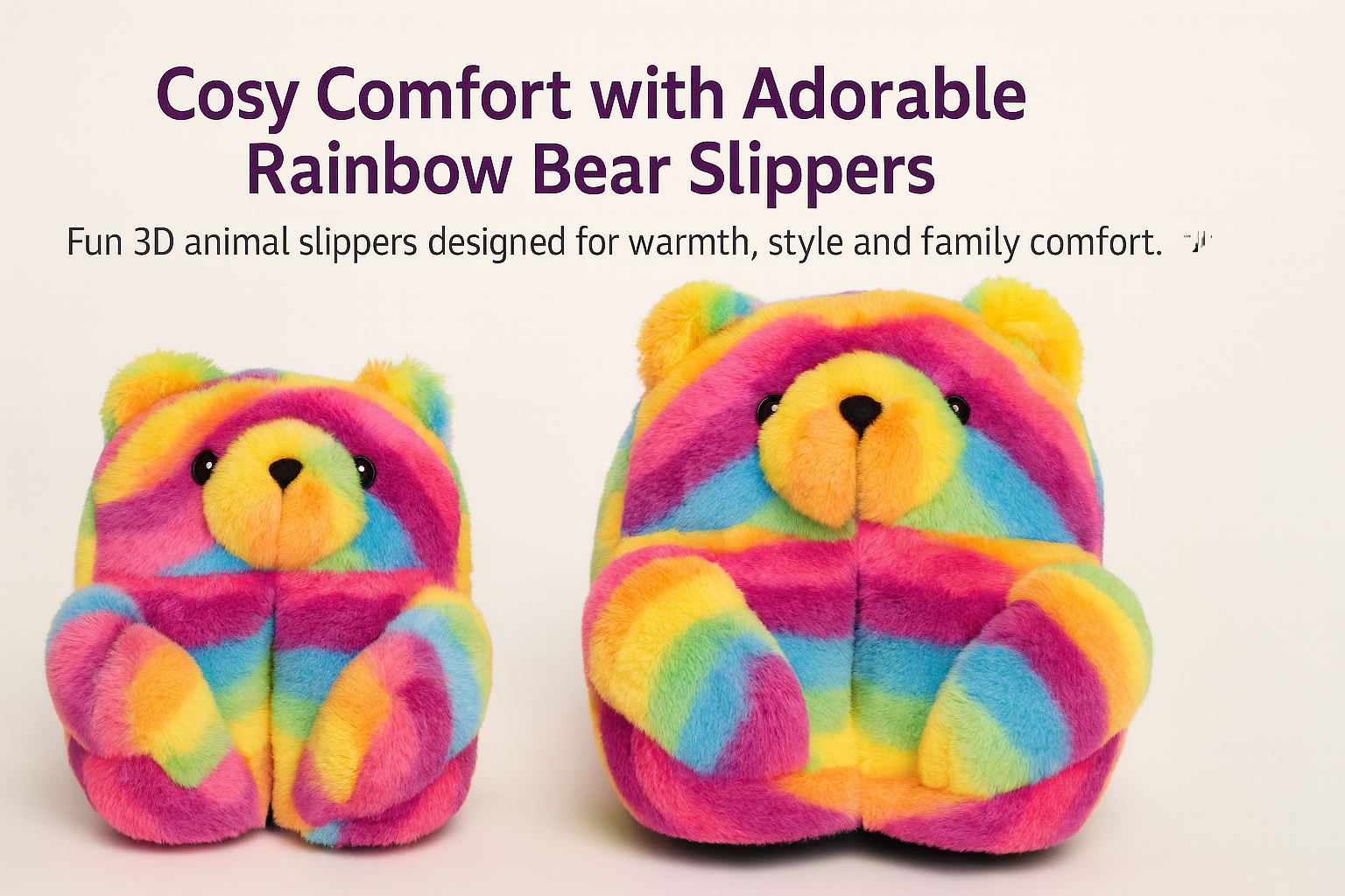 Fun rainbow coloured bear slippers with a detailed 3D face and plush ears bring joy to every step. Perfect for adding a playful touch at home, lounging, or sleepovers, these slippers brighten up your day while keeping feet snug, making them an ideal gift for kids and women who love cute animal designs.