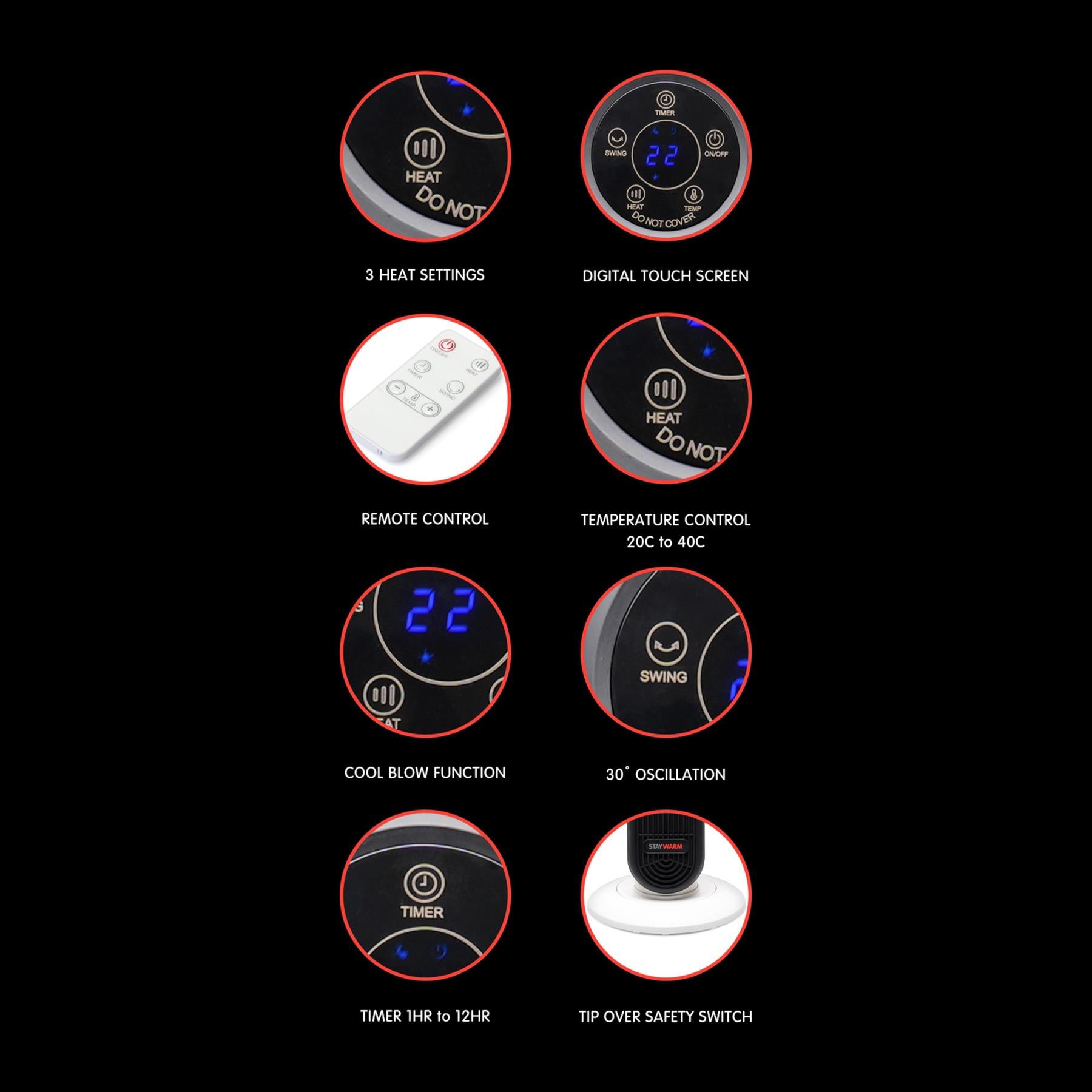 The modern touch screen allows easy access and full control, showing the exact temperature of the room and has a built-in timer to turn off when no longer desired. Timer operates in 1hr intervals to 12hr max. -