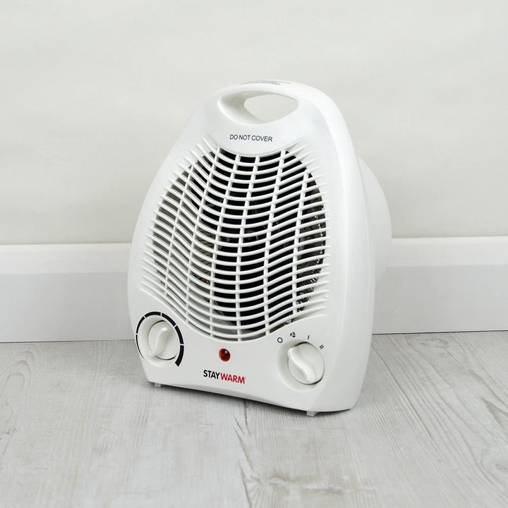 The 2000w Upright Fan Heater has a simple white design and is lightweight with an integral carry handle for easy transportation. The compact design is ideal for use in the home or office and is small enough to easily store away after use. The red power indicator is illuminated during use to indicate that the heating element is active