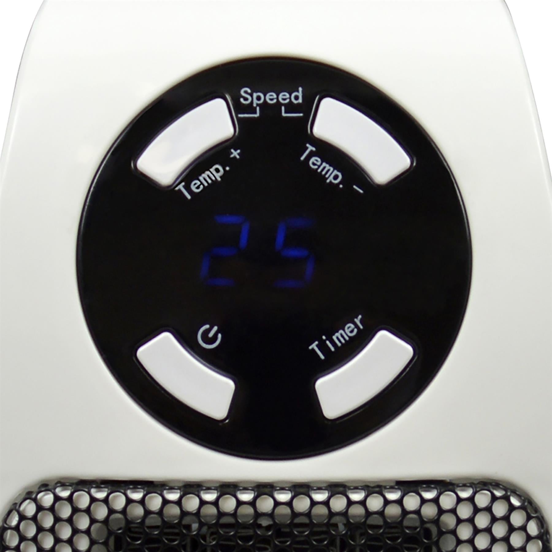 The Plugin Power Heater features a temperature range of 15-30°C, which is managed through the LED display for convenient use throughout the day and night. The LED display allows for the regulation of fan speed (low or high), temperature adjustment, and the scheduling of a 1-12 hour sleep timer, which will automatically power off the device. -