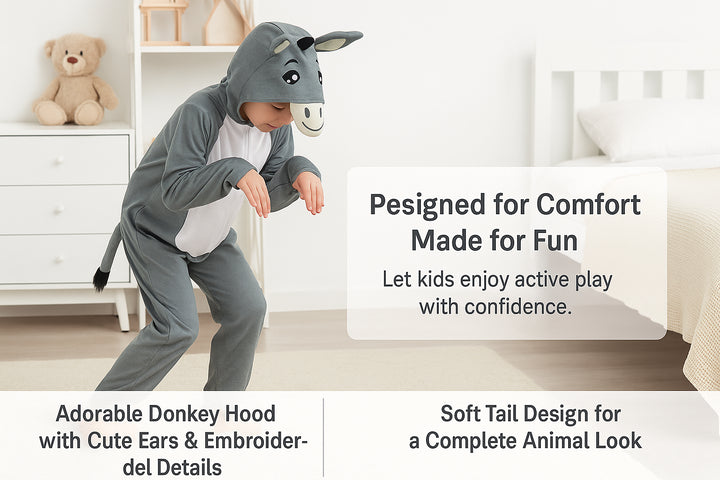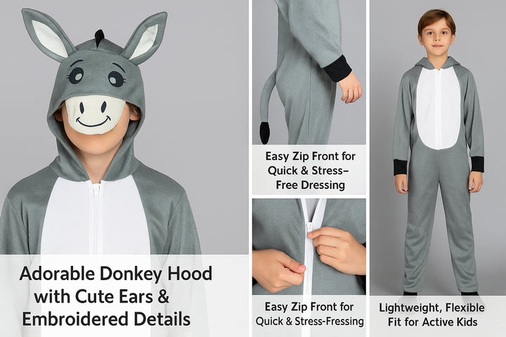 This adorable donkey costume brings fun to school plays, book day events and themed parties. With a friendly embroidered face, 3D ears and a soft tail, it makes dressing up enjoyable and imaginative. The hood offers a charming character look while the simple zip fastening ensures quick and easy wear for busy mornings.