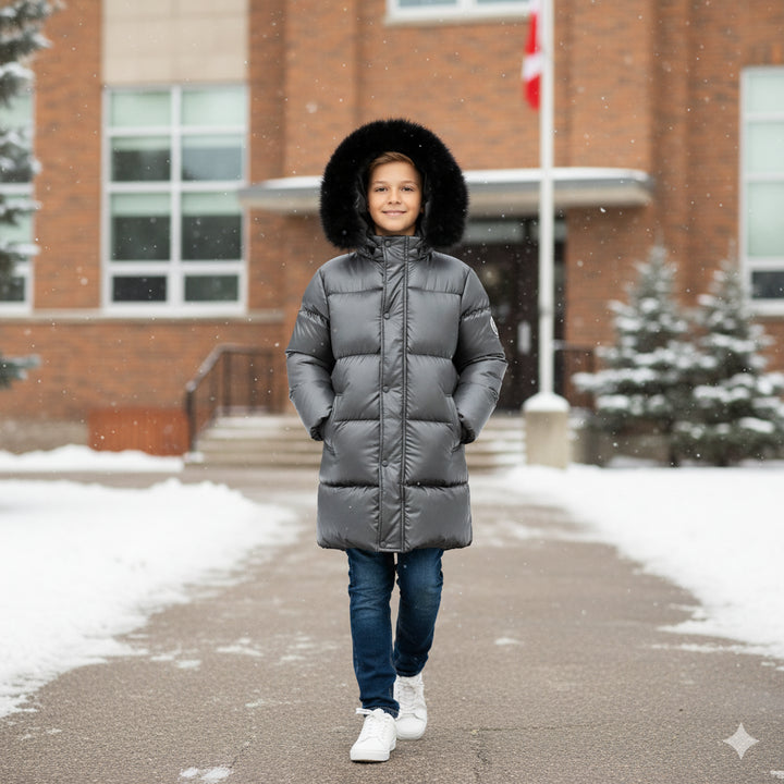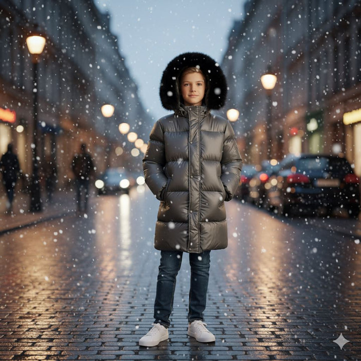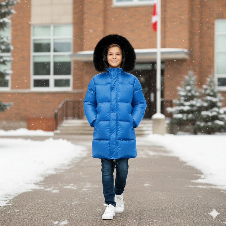 This boys long puffer coat is crafted to keep kids warm during the coldest days, featuring a thick padded design and extended length for added coverage. Ideal for school, outdoor play, winter walks and everyday wear, it combines practicality and modern style while ensuring children stay cosy and comfortable all season long.