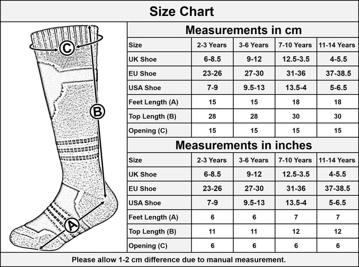 Our Boys Thermal Ski Socks are available in four different sizes, catering to boys aged 3-6 years, 7-10 years and 11-14 years. This means you can find the perfect fit for your child, ensuring they have a snug and comfortable experience while they are out in the cold. -