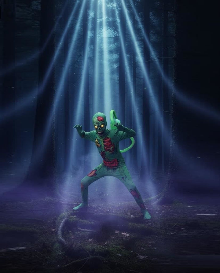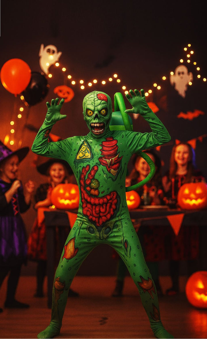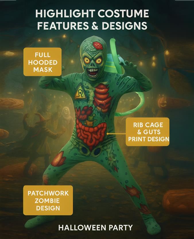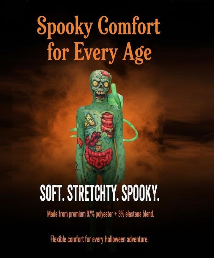 A complete, full-body Jumpsuit that covers the head, hands, and feet, transforming your kid into a scary, undead monster in seconds. -