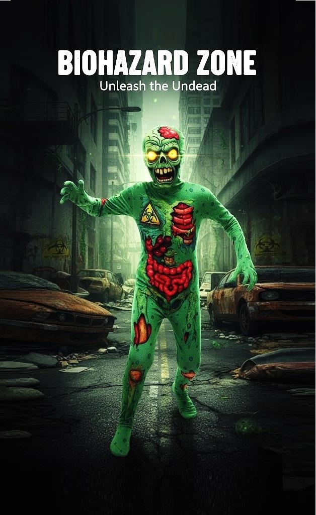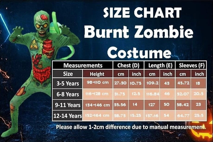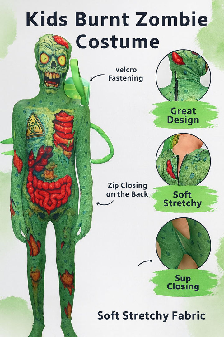 Turn your child into a spooky zombie with this realistic burnt skin and exposed organs print with a terrifying zombie face. Perfect for Halloween parties, school events, and trick-or-treating.