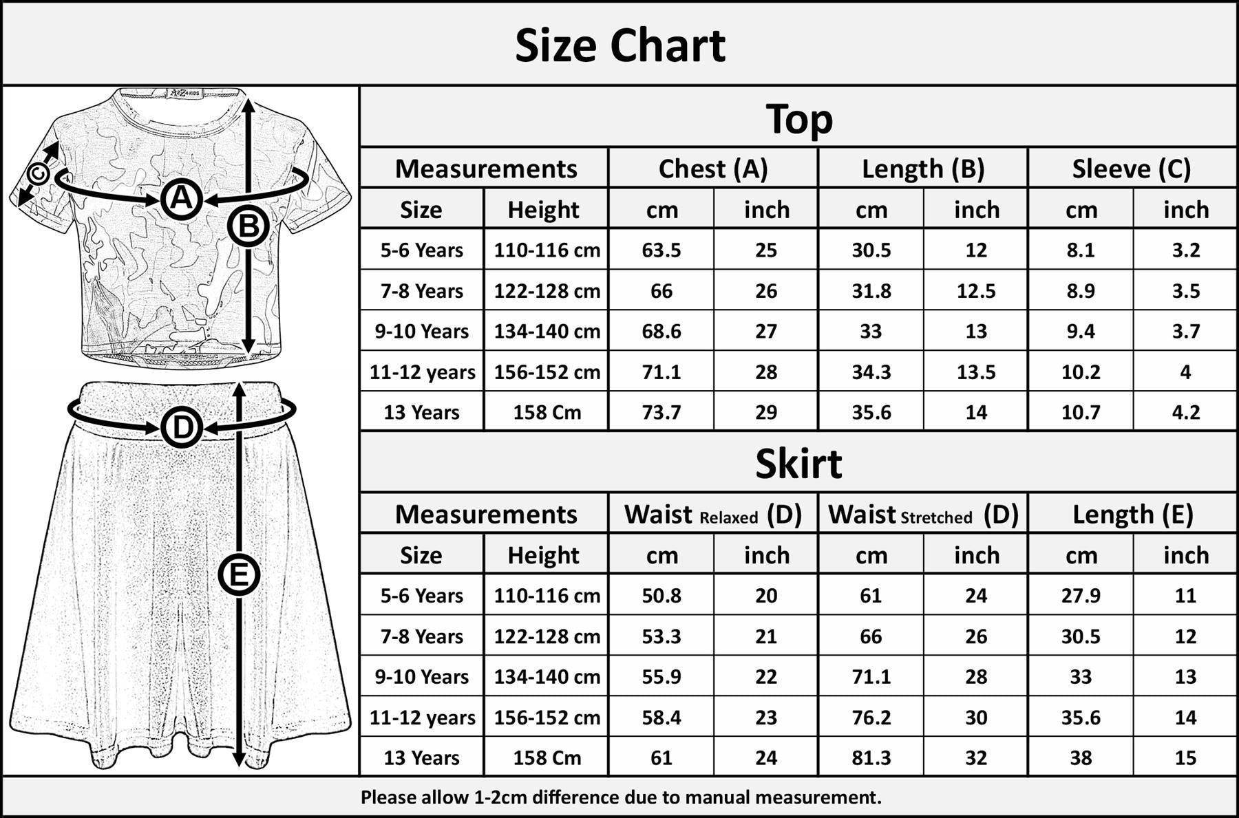 Manufactured using high quality materials - skirt 100% Polyester - top 95% Polyester 5% Elastane. Featuring an A2Z camo print short sleeve crop top, with a plain black skater skirt to complete the look. Check the size chart for best fit. For ages 5- 13.