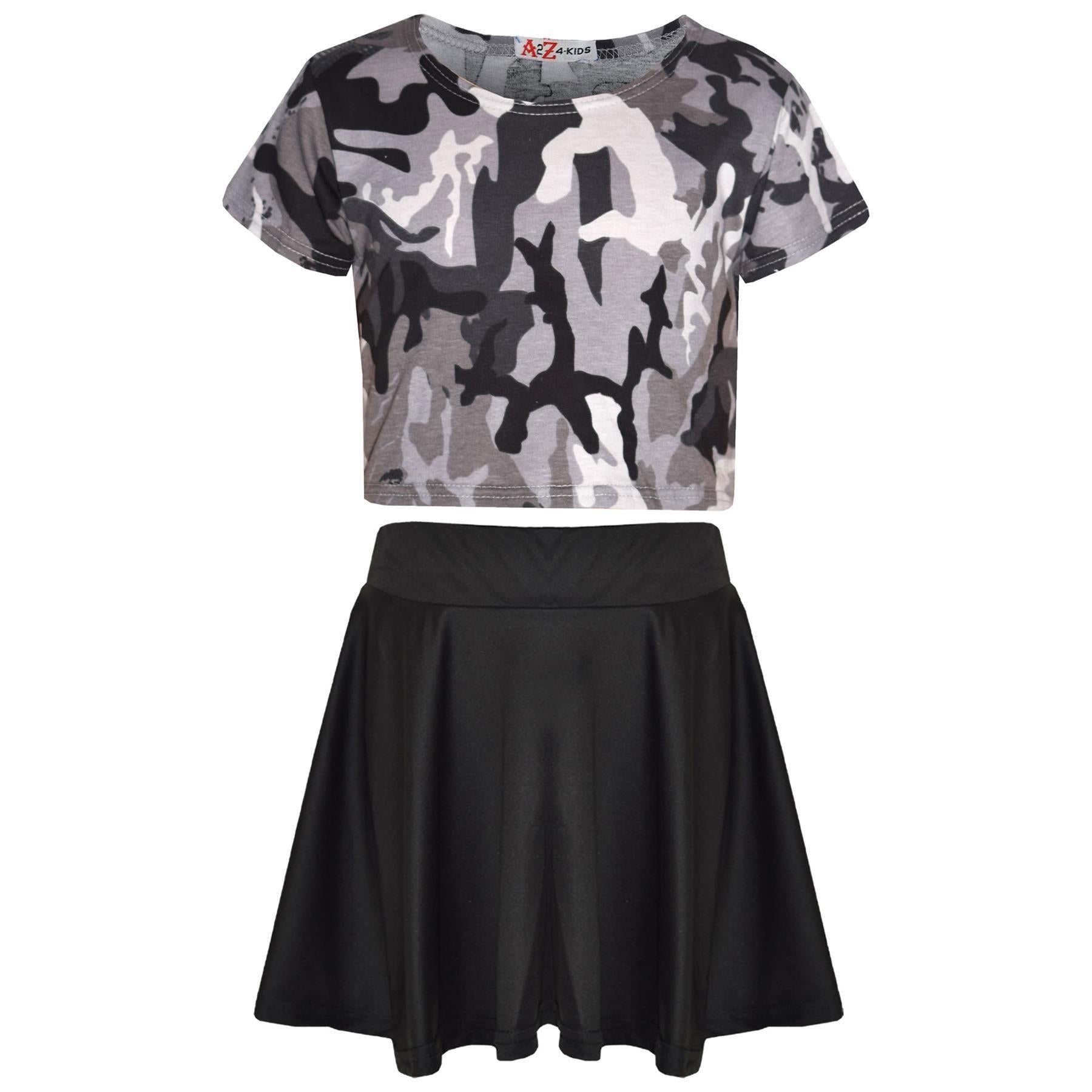 A2Z 4 Kids Camouflage Crop Top & Skater Skirt Set Short Sleeves T Shirt Summer Outfit 2 Piece Activewear For Girls Age 5-13 years
