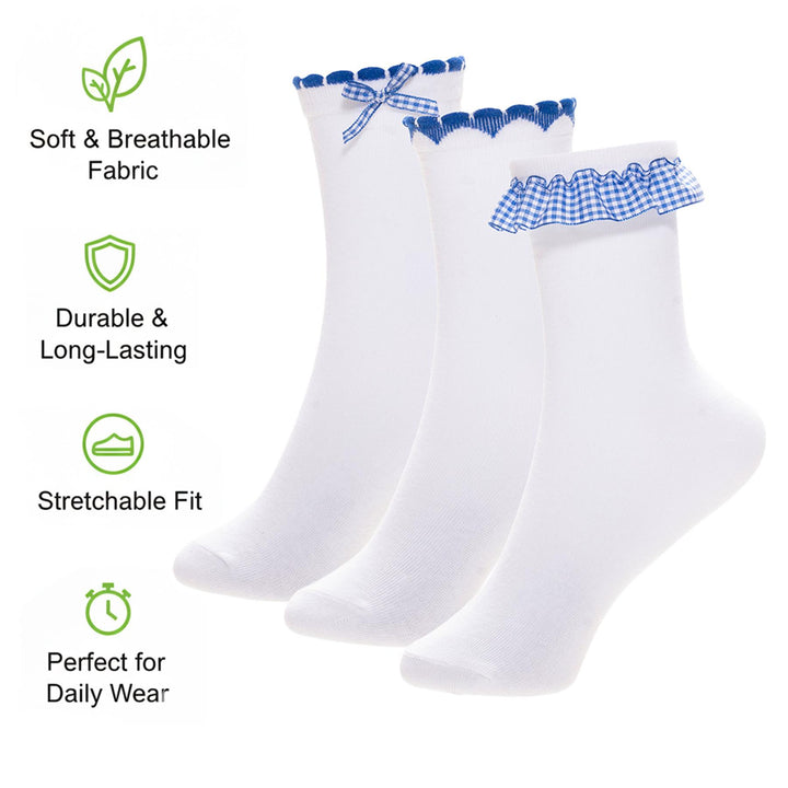 A2Z 4 Kids Girls 3 Pack Gingham Lace Trim Frill & Bow School Ankle Socks