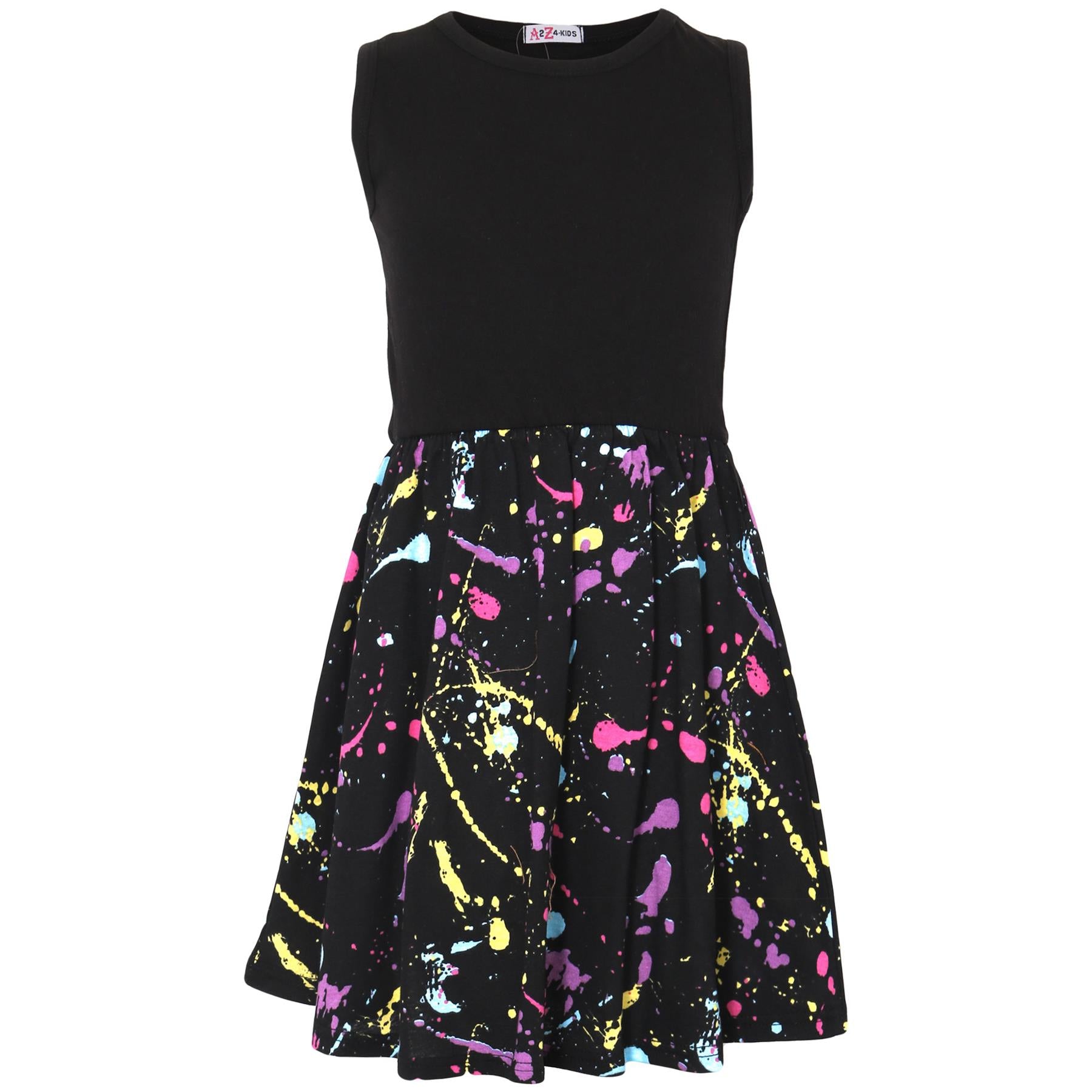 A2Z 4 Kids Girls Black Panel Skater Dress Pastel Splash Print Fashion Party Top Summer Dresses New Age 5 6 7 8 9 10 11 12 13 Years