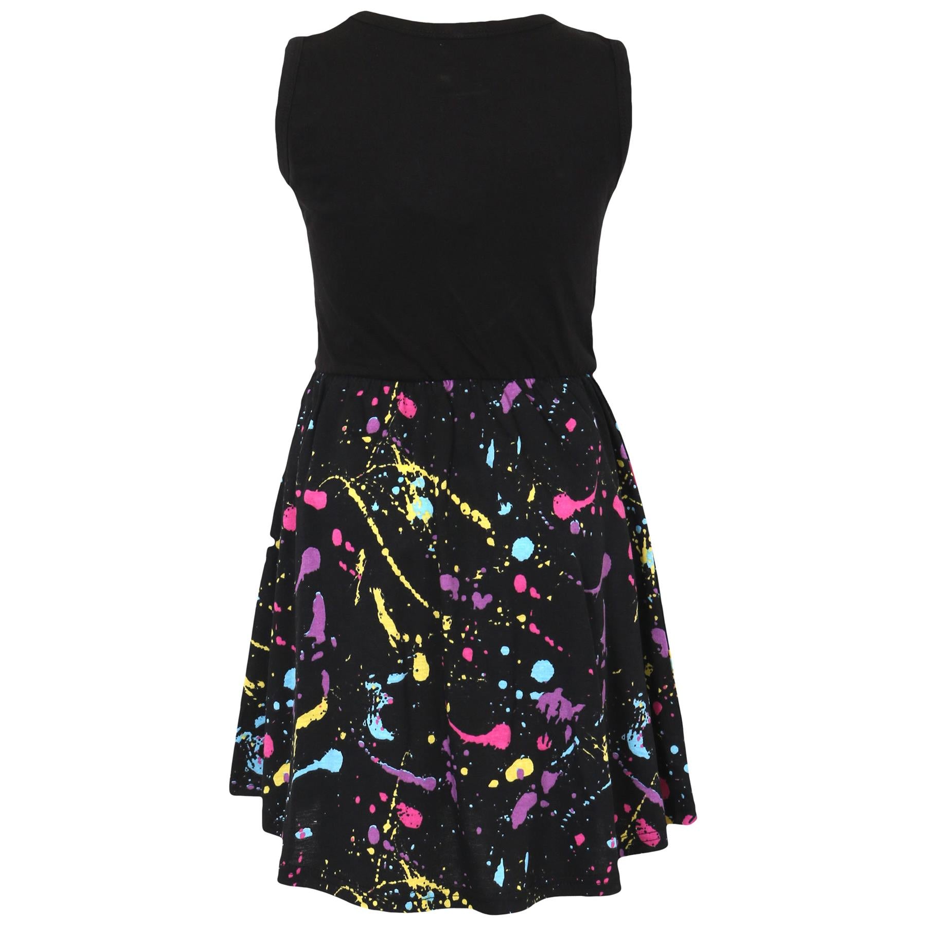 Kids Girls Splash Print Black Panel Skater Dress Girls Summer Party Outfit Dresses Splash Print Printed On The Fabric Made From Soft Stretchy Comfortable Material 100% Cotton Please Note: Actual Colors May Vary Slightly From Pictures Due to Different Screen Display Settings & Lighting Effects In The Studio.