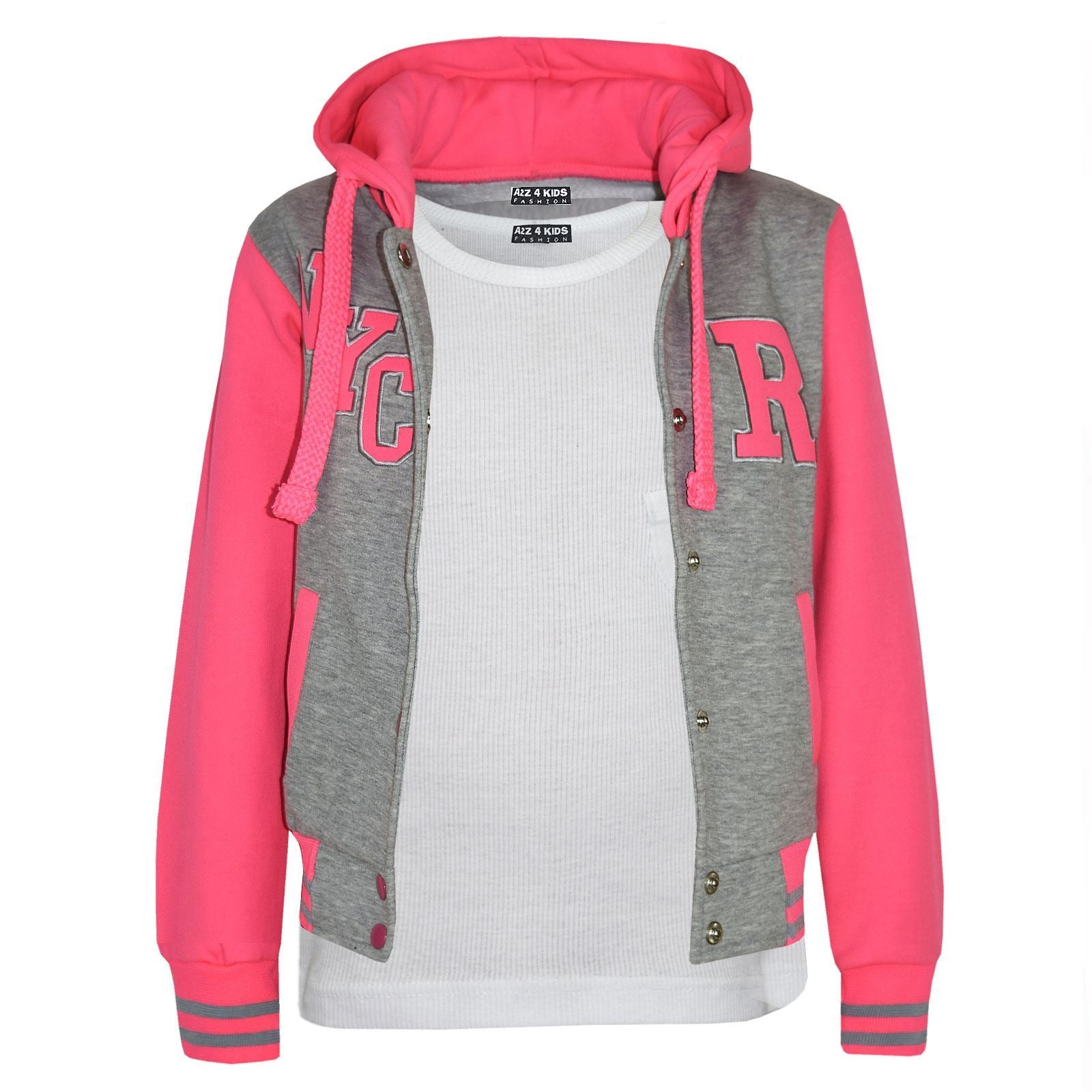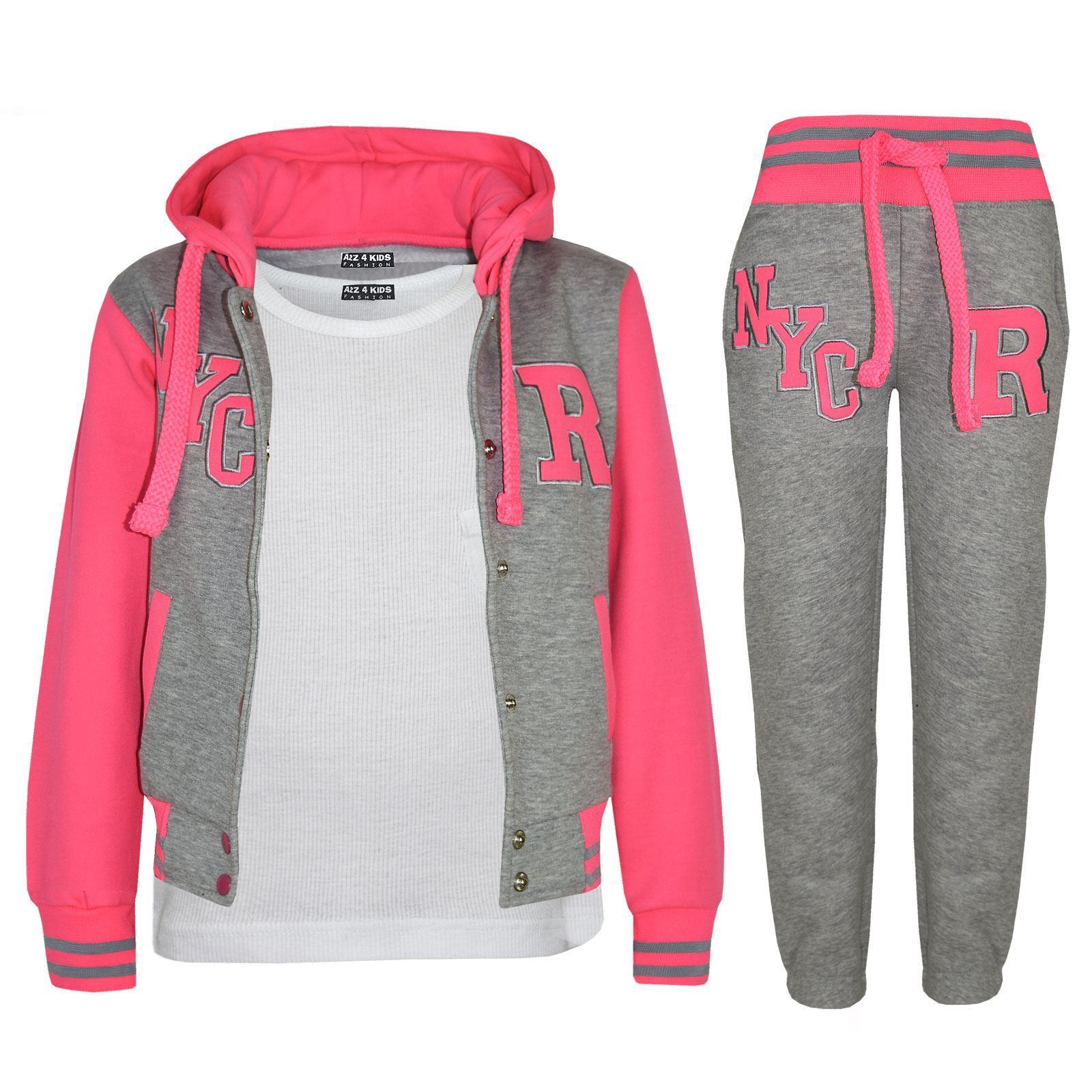 A2Z 4 Kids Girls Boys Grey & Neon Pink Baseball Tracksuit NYC Jacket & Trouser Sports Hoodie Bottom Joggers Age 2 3 4 5 6 7 8 9 10 11 12 13 Years