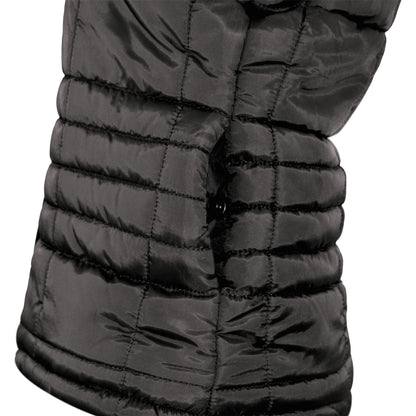 Manufactured from high quality 100% Polyester. This puffer coat features a hood, two pockets on the front, and a full front zip.