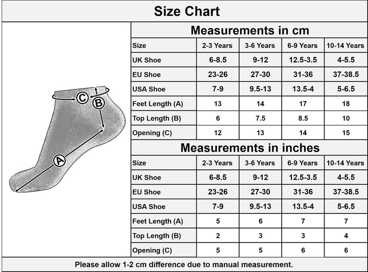 Our socks are thoughtfully designed to grow with your child, available in four age-appropriate sizes: 2-3 years, 3-6 years, 6-9 years, and 10-14 years. Featuring a selection of timeless colours: White, Black, Navy and Grey, they blend simplicity with sophistication. Tailored for a snug, comfortable fit, these socks adapt to your childs growth, saving you from the hassle of constantly replacing too-small socks. -