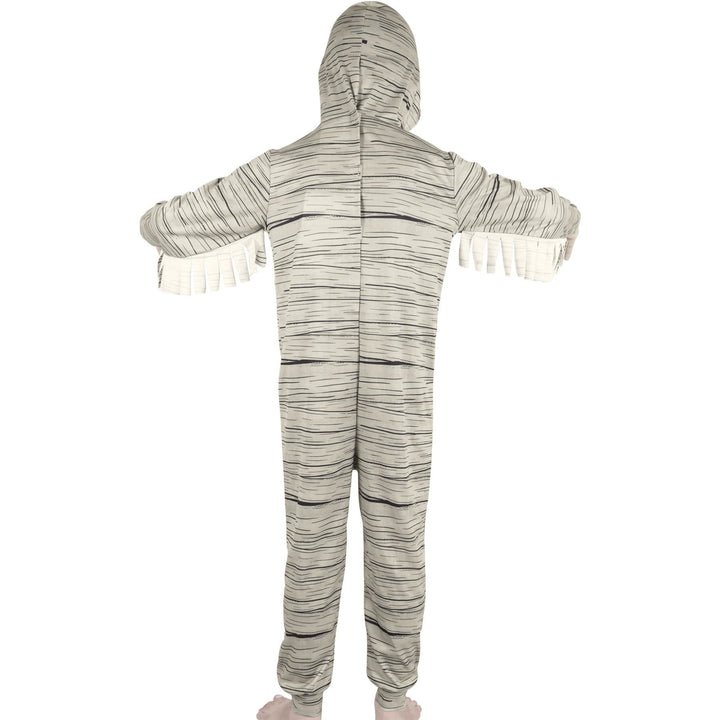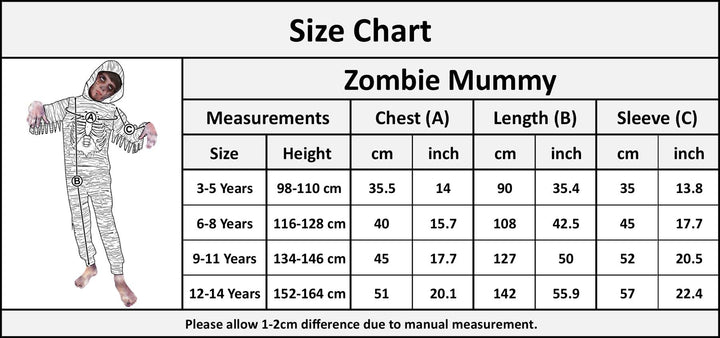 SPOOKY ELEGANCE FOR LITTLE GHOULS AND GOBLINS: Transform your little ones into the undead with our Zombie Mummy Halloween Outfit! Perfect for both girls and boys, this Outfit takes Halloween dress-up to a whole new level of spooky fun. Whether they are roaming the neighborhood for tricks and treats or attending a Halloween party, your kids will be the center of attention in this eerie ensemble. HOODED MYSTERY: This chilling Outfit features a hooded design that adds an extra layer of mystery to your child's transformation. The hood drapes over their head, concealing their identity while letting them see through just enough to navigate the Halloween night safely. It is the perfect touch to complete the undead look. TORN AND TATTERED: The Zombie Mummy Halloween Outfit comes with shredded sleeves, creating a realistic appearance of decaying mummy wrappings. The ribbed cuffs on the sleeves and ankles not only add authenticity but also help keep the Outfit securely in place as your little one explores their haunted domain. UNBEATABLE COMFORT: Crafted from 100% polyester, this Outfit is not only frighteningly realistic but also exceptionally comfortable. Your child can move freely and enjoy hours of Halloween adventure without feeling constrained. The soft fabric ensures they would not want to take it off even after the festivities are over. WRAPPED IN SPOOKY STYLEL: One of the standout features of this Outfit is the hanging bandages. These eerie, hanging strips of fabric give your little zombies a genuinely menacing appearance. Whether they are creeping through the shadows or participating in a Halloween parade, these hanging bandages are sure to turn heads and elicit spine-tingling screams.
