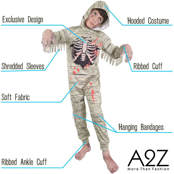 A2Z 4 Kids Girls Boys Spine Chilling Zombie Egyptian Mummy Halloween Attire Hooded Shredded Sleeves Ribbed Cuffs Soft Fabric Perfect Outfit for Trick or Treating and Halloween Parties