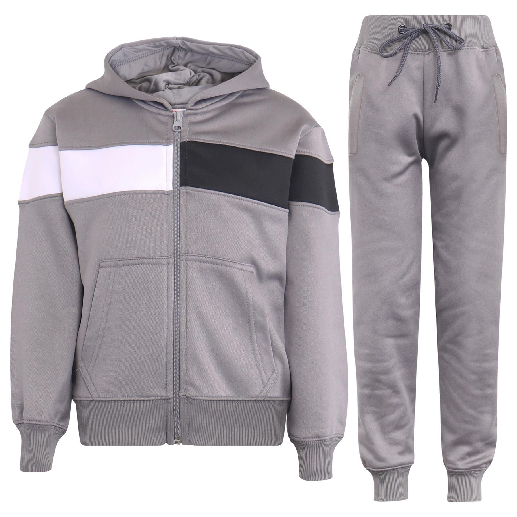 Kids Girls Boys Tracksuit Contrast Panelled Steel Grey Hooded Jogging Suit Kids Girls Boys Contrast Panelled Tracksuit Contrast Panel Beautifully Stitched On The Front Of The Top Hooded Hoodie Zip Up Top & Bottom Ribbed Cuffs On The Legs & Sleeves 100% Polyester Please Note: Actual Colors May Vary Slightly From Pictures Due to Different Screen Display Settings & Lighting Effects In The Studio.