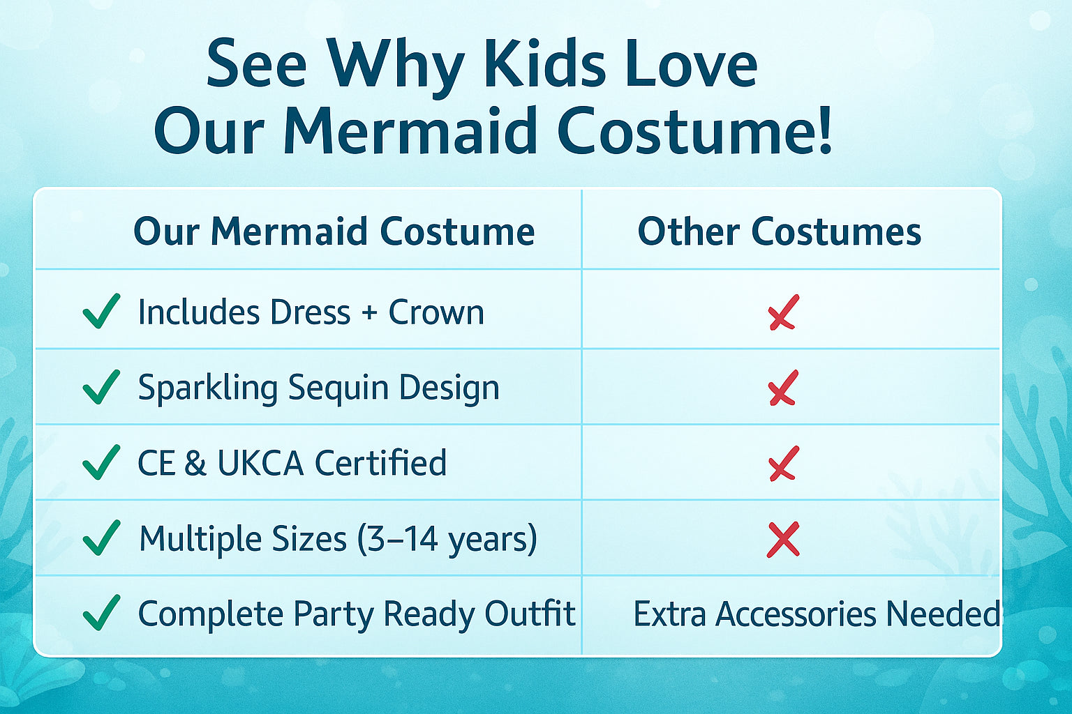 Includes a sparkly mermaid dress and matching crown to complete the magical look. Easy pull-on design makes dressing up quick and fuss-free. A complete outfit ready for playdates, trick-or-treating, and special occasions without needing extra accessories.