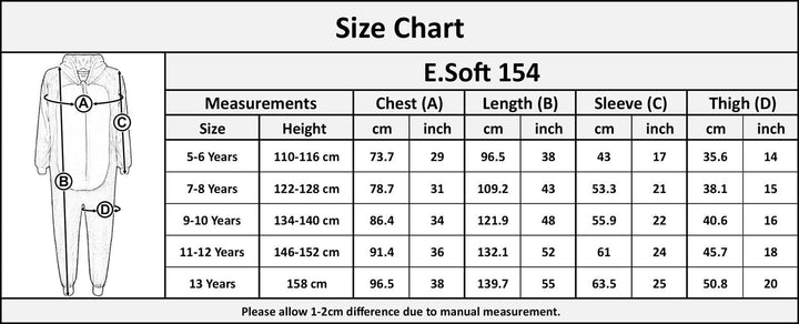 These super-soft hooded onesie pieces are available in various sizes to suit various ages, including 5-6 years, 7-8 years, 9-10 years, 11-12 years, and 13 years. This extensive size range ensures a comfortable fit for children at different stages of growth.