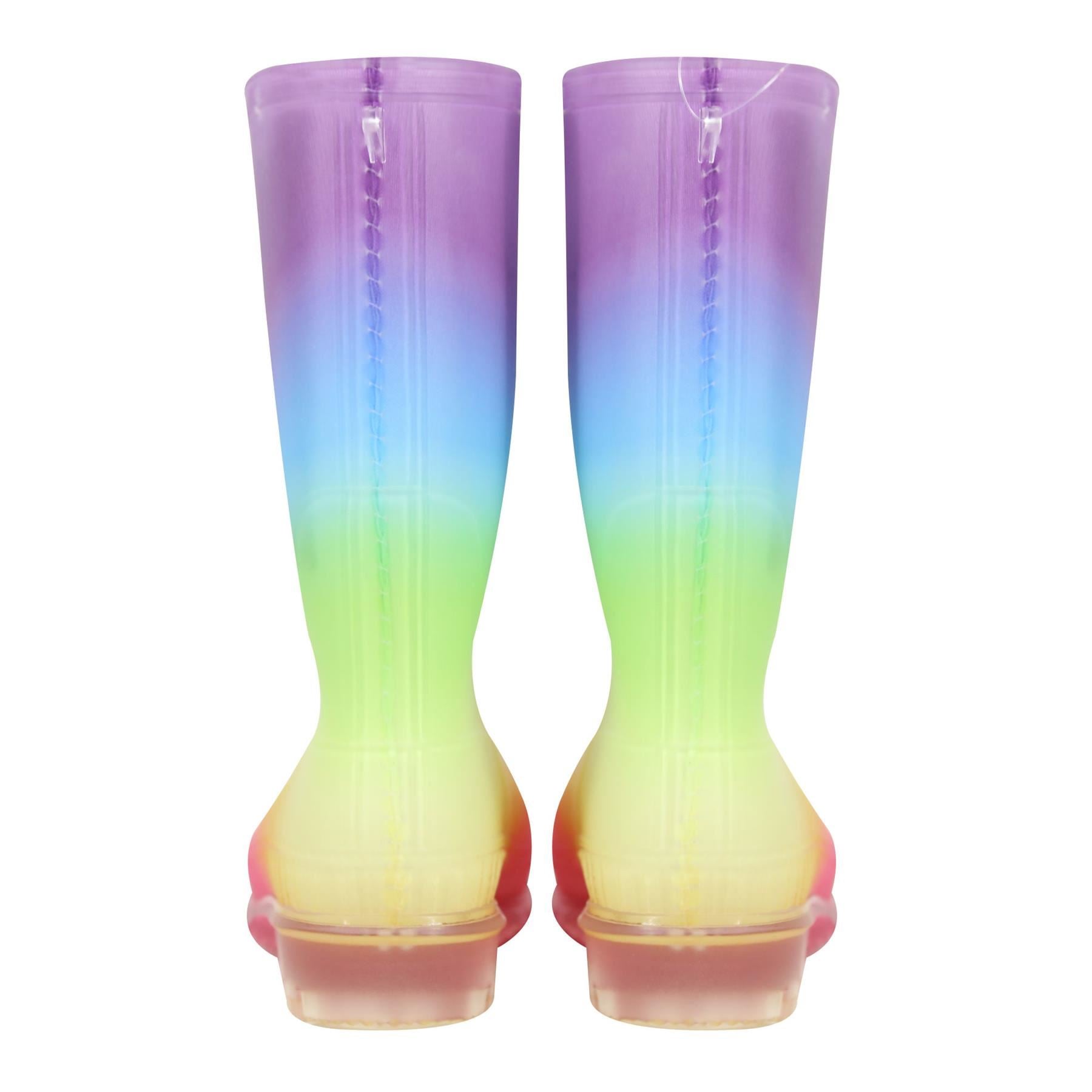 Bright and cheerful multi-colour gradient design transitioning from purple to pink, blue, green and yellow, making these rain boots a fun and eye-catching choice for girls. Perfect for playtime in rainy weather, puddle-jumping, or outdoor school trips.