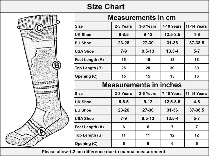 Our Girls Thermal Ski Socks are available in four different sizes, catering to Girls aged 3-6 years, 7-10 years and 11-14 years. This means you can find the perfect fit for your child, ensuring they have a snug and comfortable experience while they're out in the cold. -