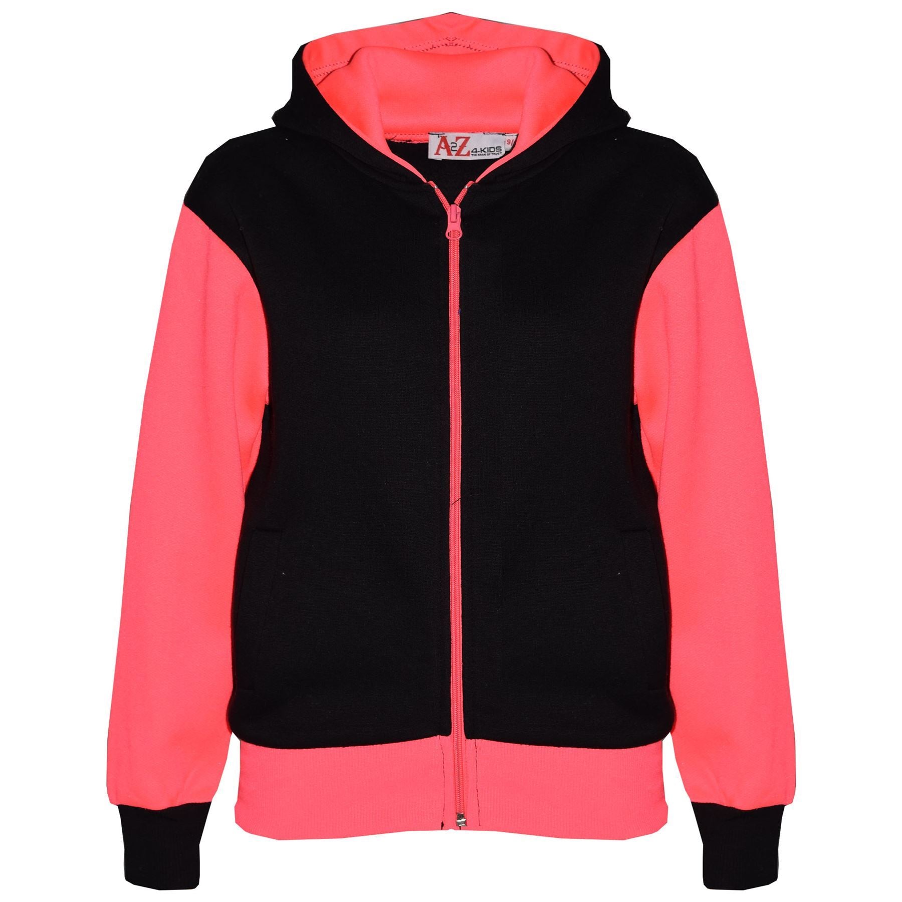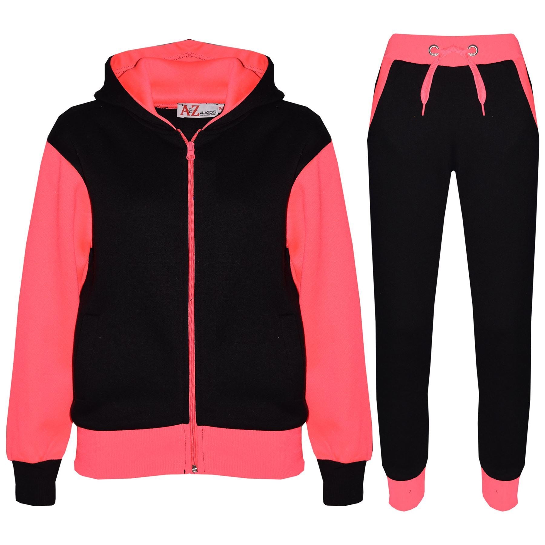 A2Z 4 Kids Plain Contrast Fleece Tracksuit Neon Pink Hooded Top And Bottom Sweatpants Joggers Sports Gymwear Jogging Suit Activewear Hoodie With Jogger Set Girls Childrens Age 5-13 Years
