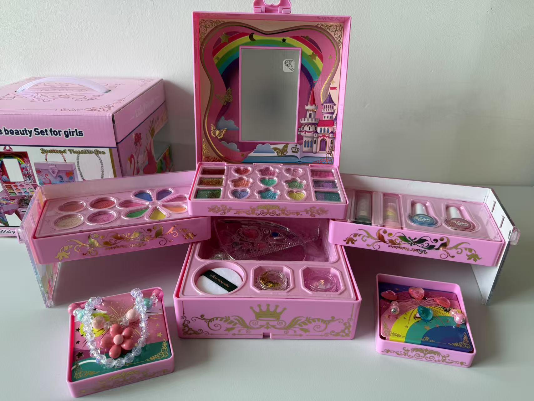 The princess makeup kit includes eyeshadows, lip gloss, nail polish, rings, beads, bracelets and more to inspire imaginative role play. Little girls can dress up as princesses or ballerinas, boosting creativity and helping develop confidence and self-expression through pretend beauty routines. -