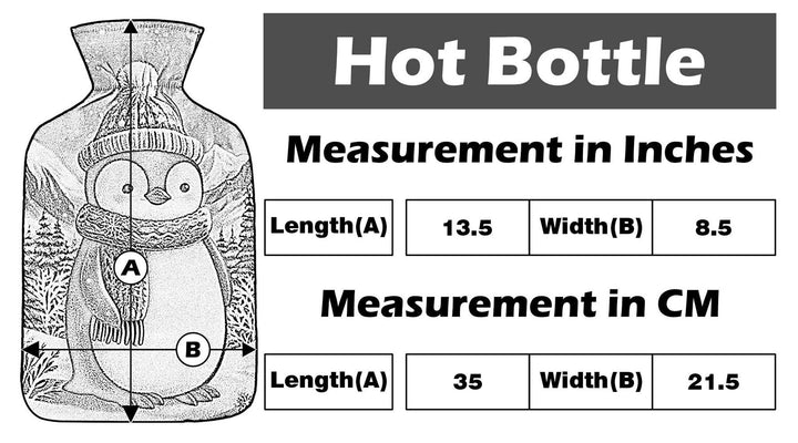 Celebrate the season with our Penguin fleece cover, adding holiday cheer and warmth to chilly nights. Crafted from high-quality rubber, this 2-litre hot water bottle ensures safe, leak-free use and consistent hourly warmth. This relieves the neck, back, and shoulders, easing muscle tension, cramps, and body aches. The fleece cover offers insulation for ultimate comfort and warmth. Perfect for relaxing.