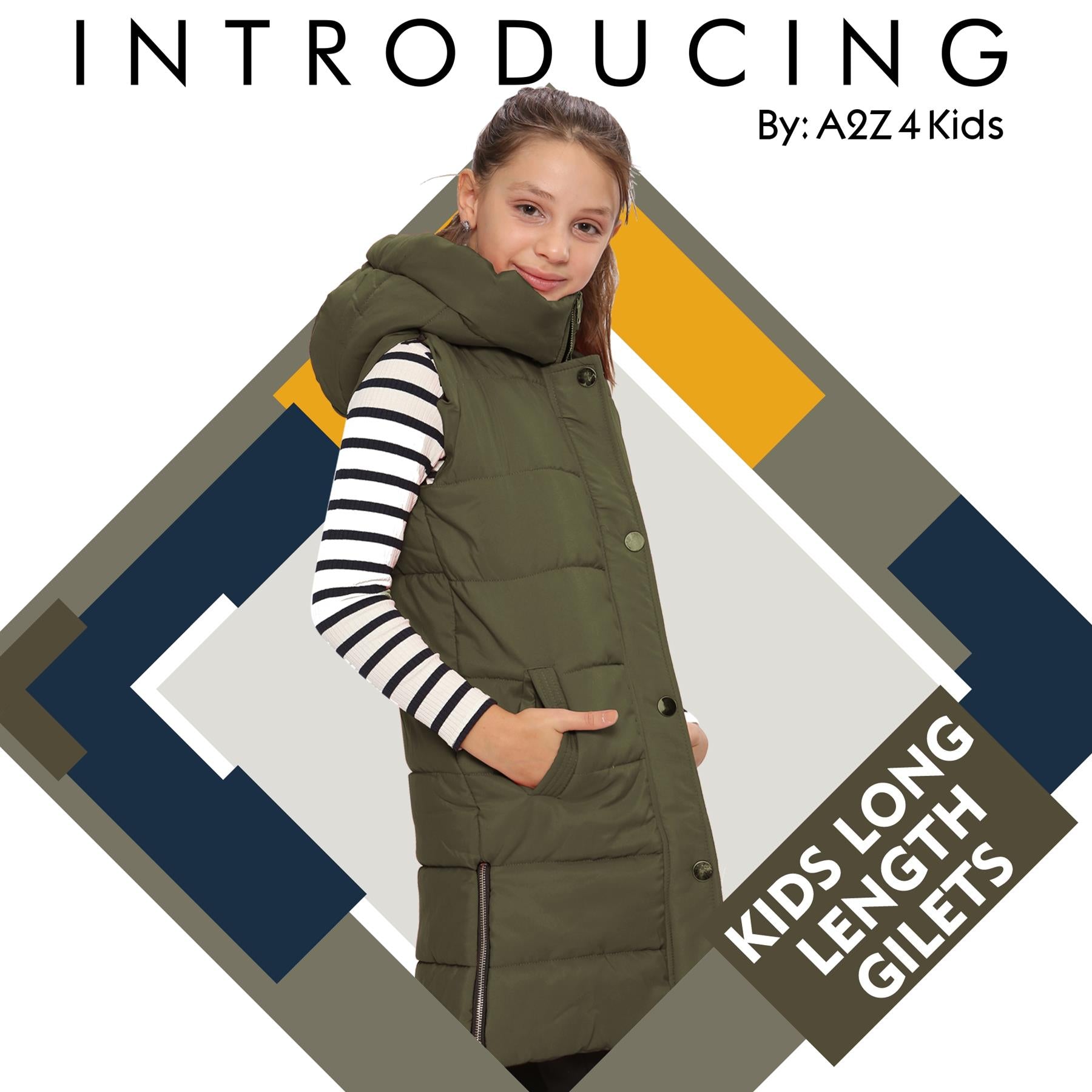 A2Z Kids Down Vest Oversized Khaki Long Sleeveless Hooded Quilted Gilet Padded Long Line Vest Jacket Coat For Girls 7-13 Years