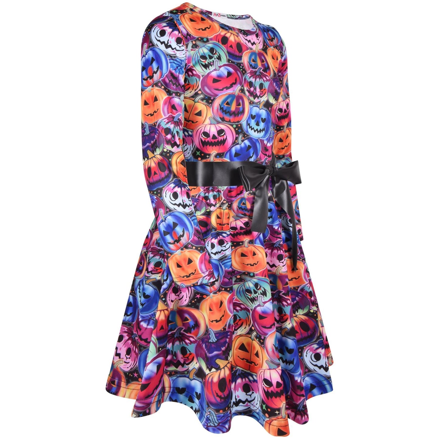 Kids Girls Skater Long Sleeves Multi Color Pumpkins Print Halloween Dre