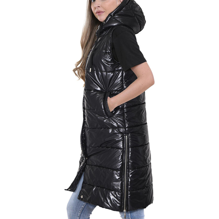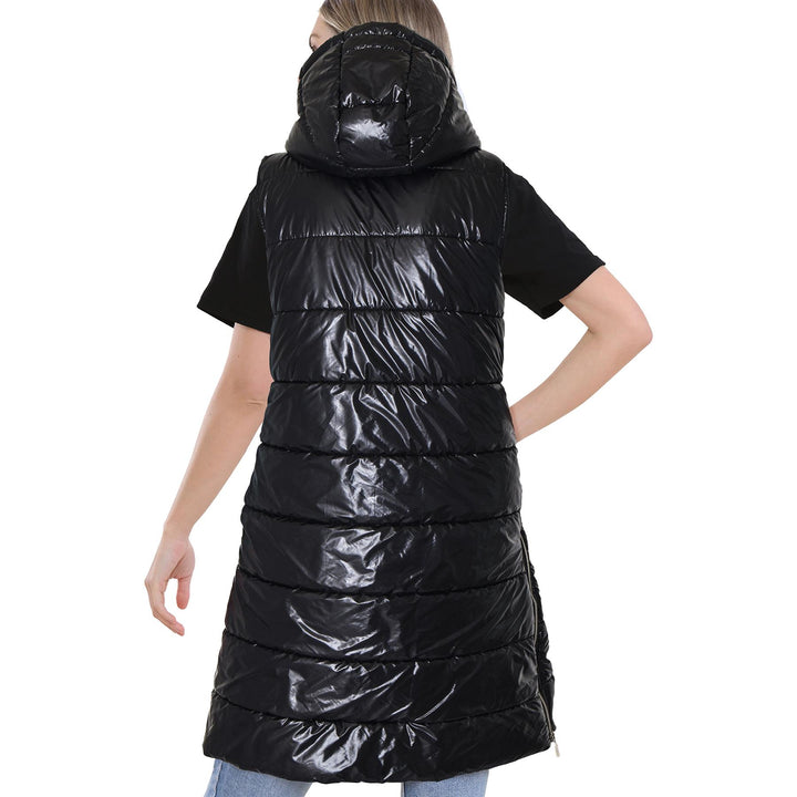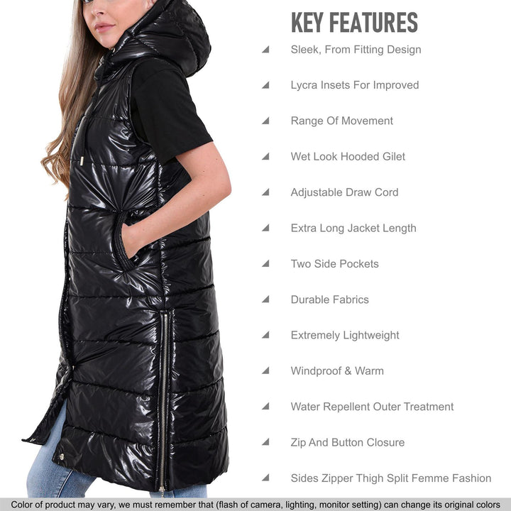 A2Z Ladies Adults Sleeveless Gilet Oversized Wet Look Hooded Quilted Gilet Padded Long Line Vest Jacket Sleeveless Coat Urban Winter Wear