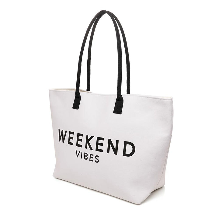Trendy WEEKEND VIBES print makes this tote bag a fashionable choice for shopping, travel, or casual outings. Its clean white canvas with bold lettering adds a modern touch, while the structured shape ensures it looks chic whether carried to the beach, gym, or city. -