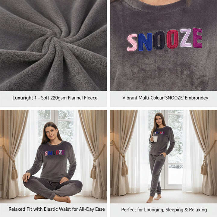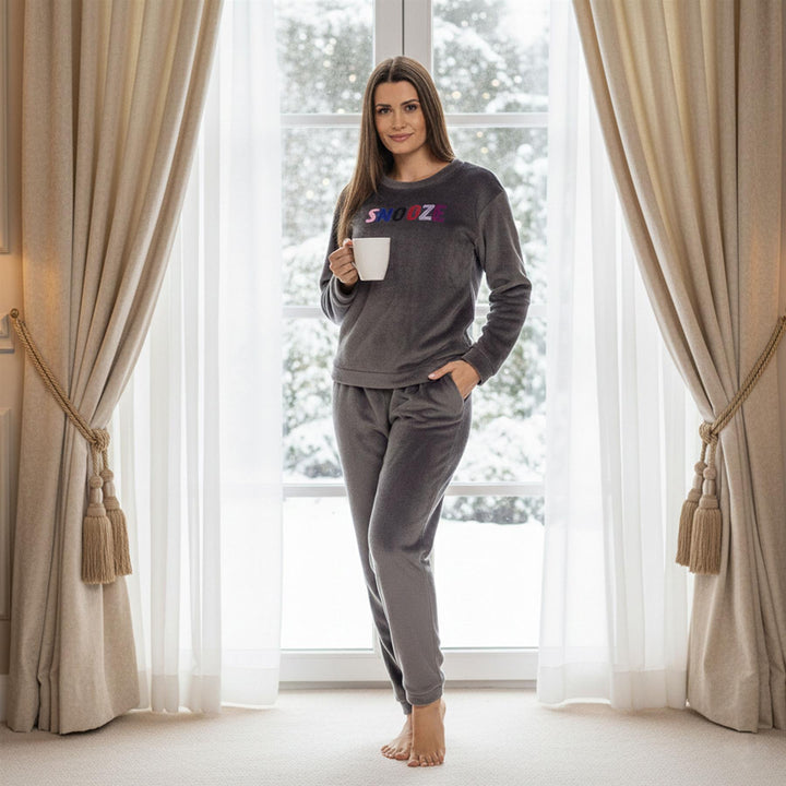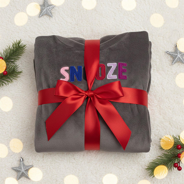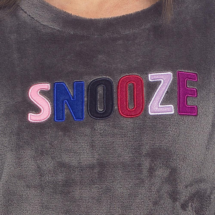 Featuring a charming multi-colour “SNOOZE” embroidered appliqué on the top, this set adds a fun and playful touch to your loungewear collection. The clean charcoal base enhances the vibrant lettering, giving a fashionable look suitable for lounging, relaxing or gifting.