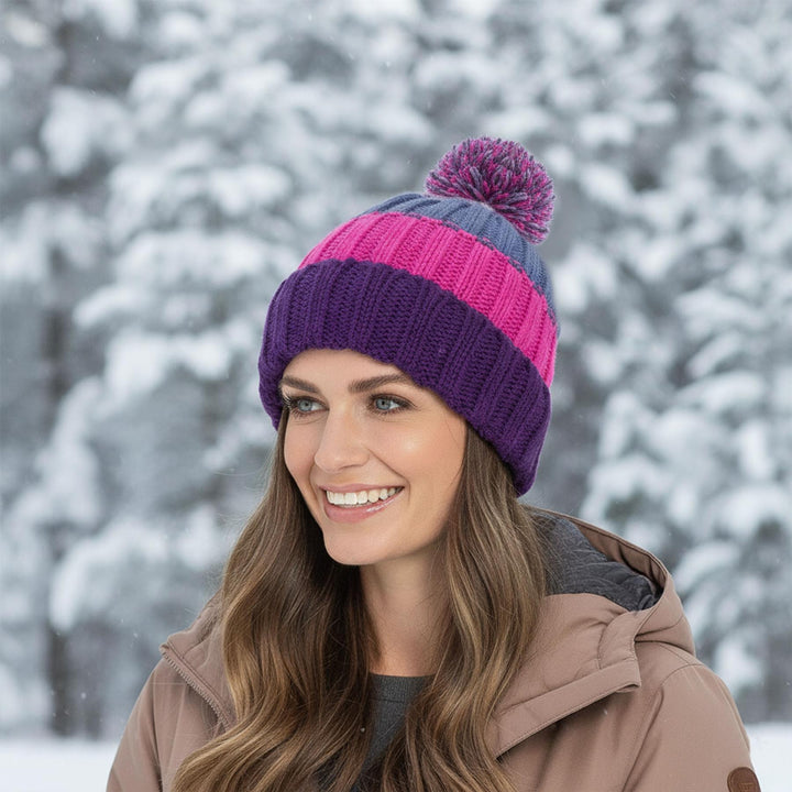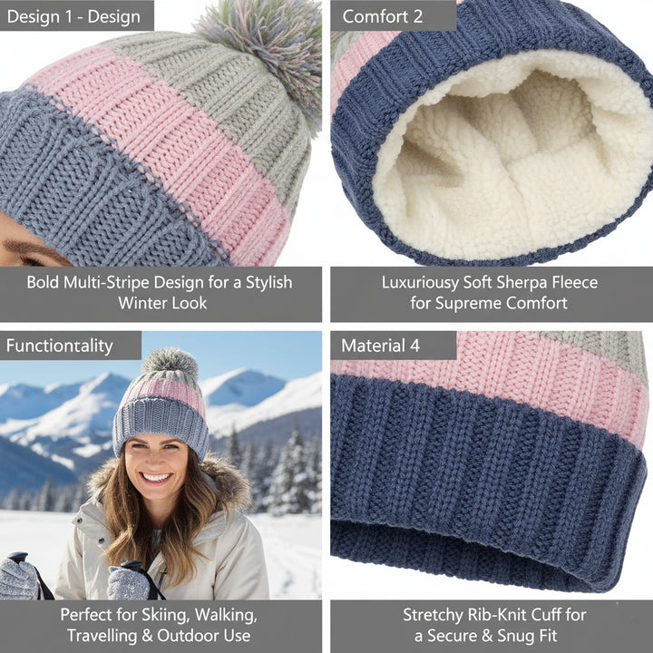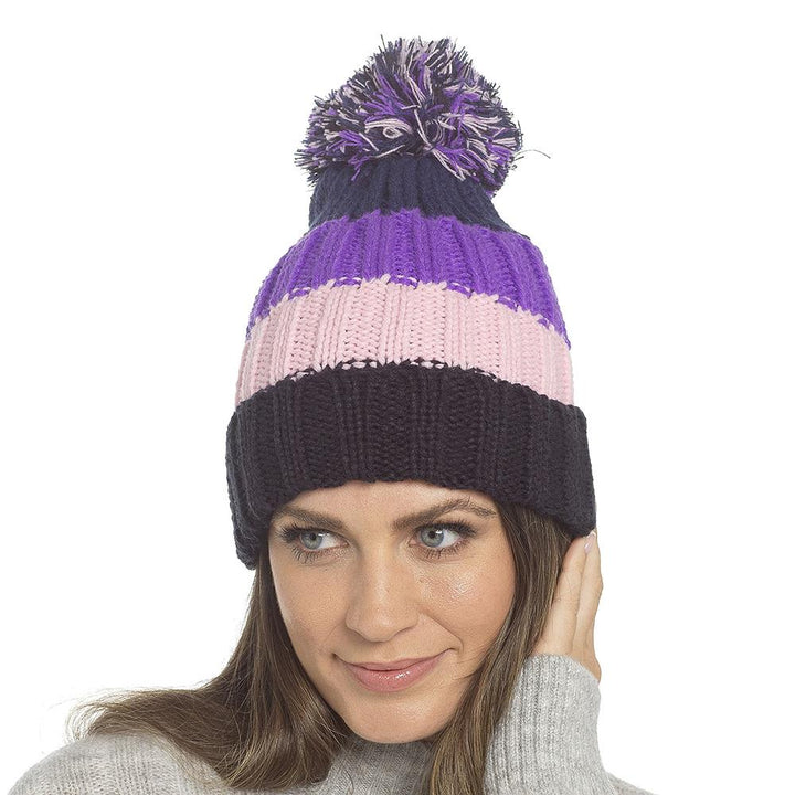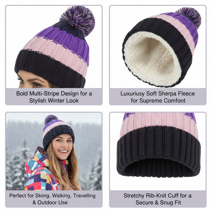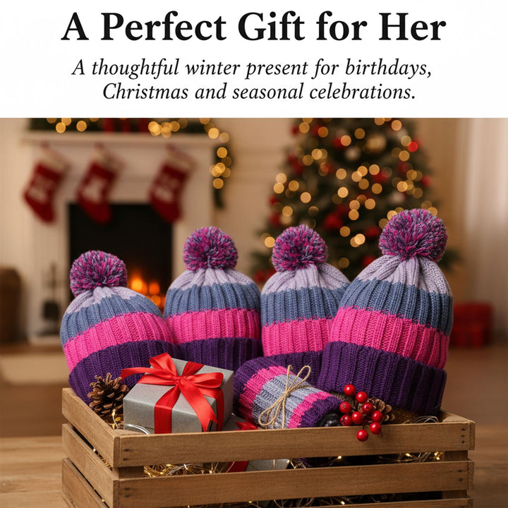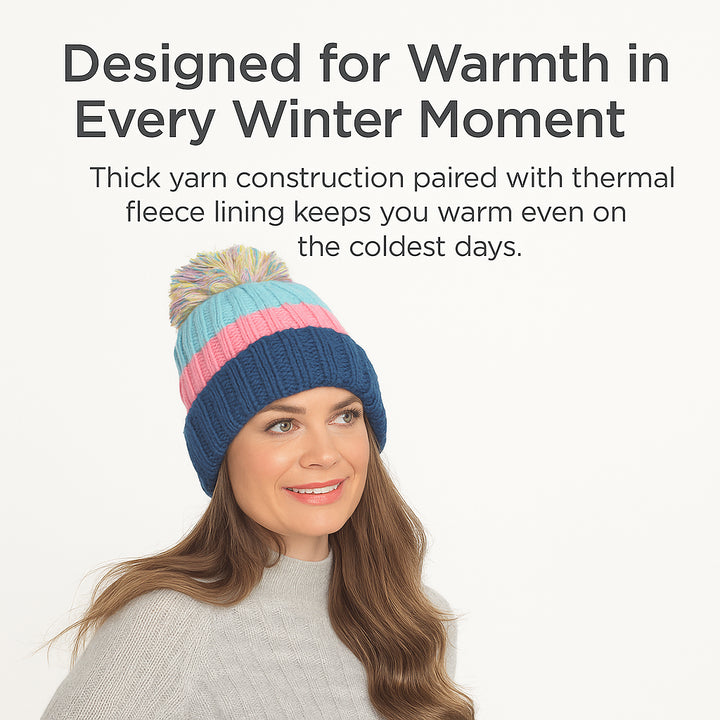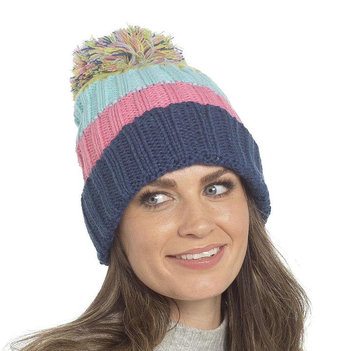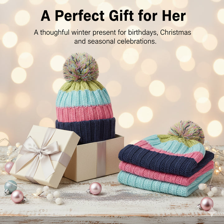 These ladies striped beanie from A2Z features a bold multi-colour knitted design with a playful pom pom, offering a stylish winter accessory that brightens cold days. The chunky rib-knit fold-over cuff adds a modern touch, making it ideal for everyday wear, winter walks, holidays, outdoor adventures and pairing effortlessly with casual or sporty outfits.