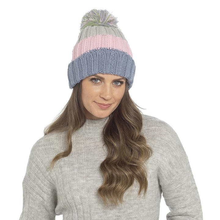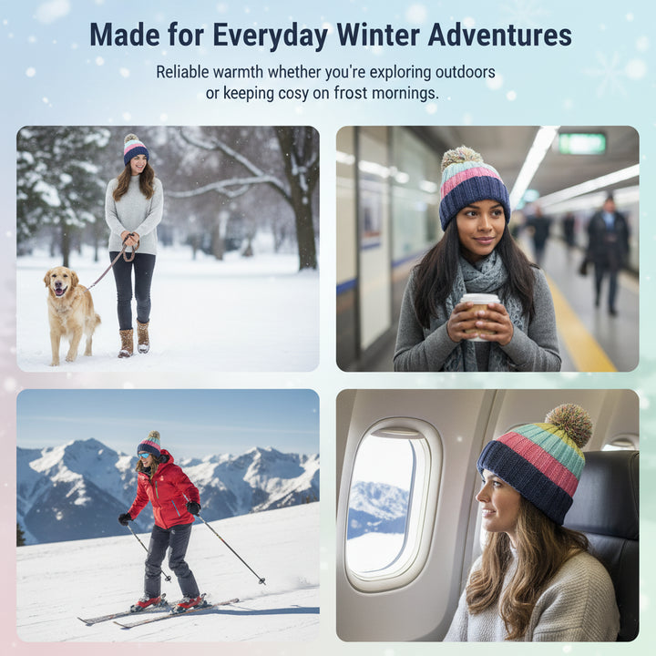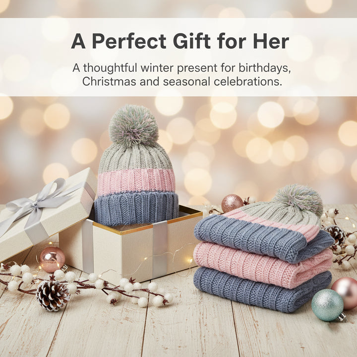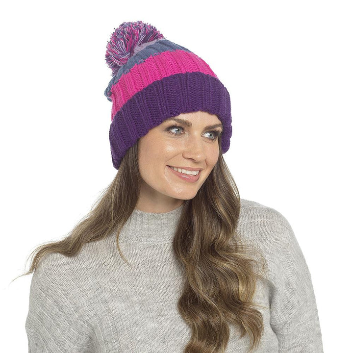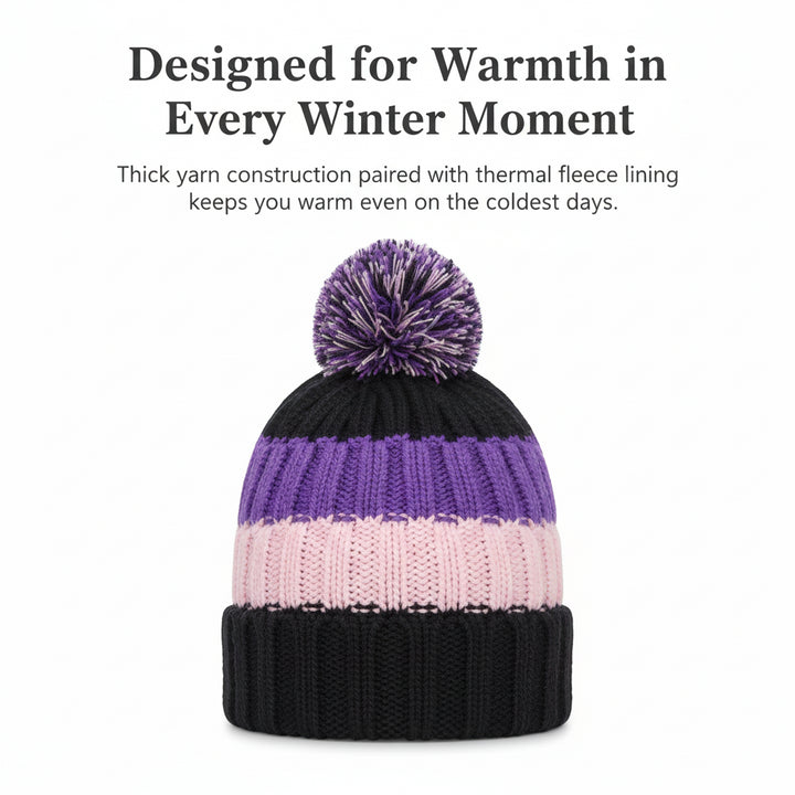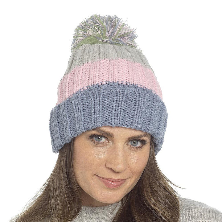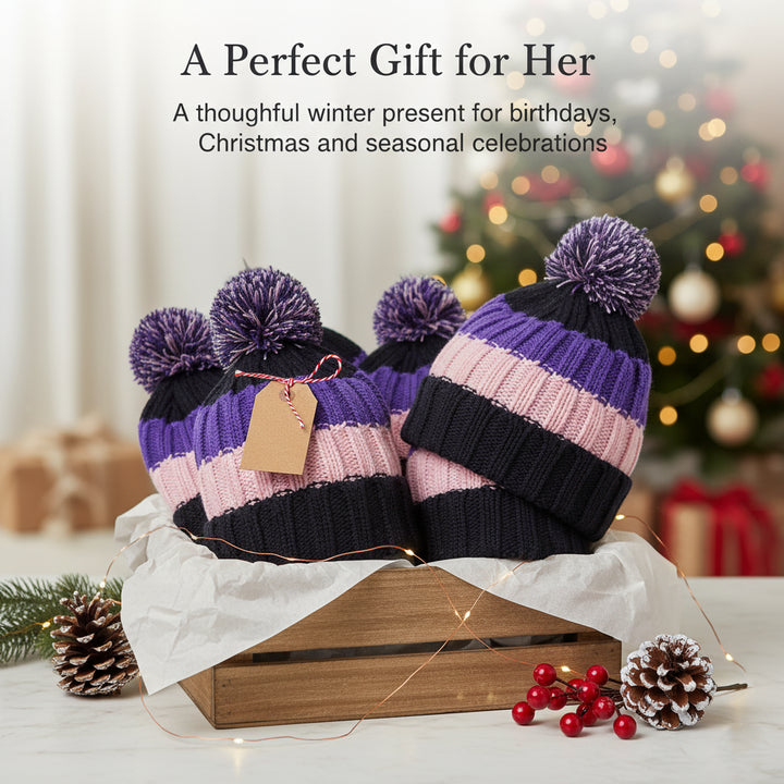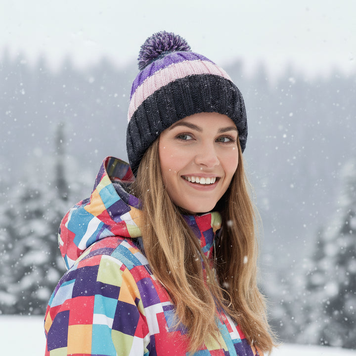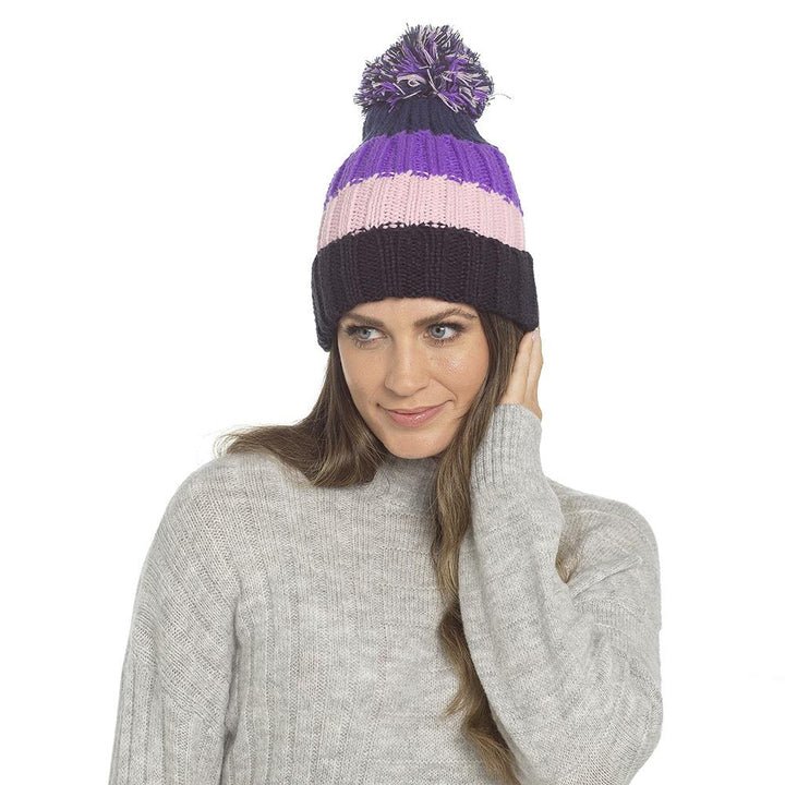 These ladies striped beanie from A2Z features a bold multi-colour knitted design with a playful pom pom, offering a stylish winter accessory that brightens cold days. The chunky rib-knit fold-over cuff adds a modern touch, making it ideal for everyday wear, winter walks, holidays, outdoor adventures and pairing effortlessly with casual or sporty outfits.