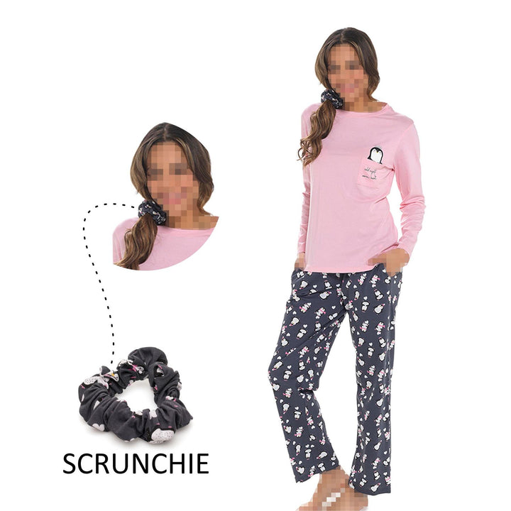 A2Z Ladies Pyjama Set Womens Varsity Penguin Cosy Pyjamas Matching Scrunchie