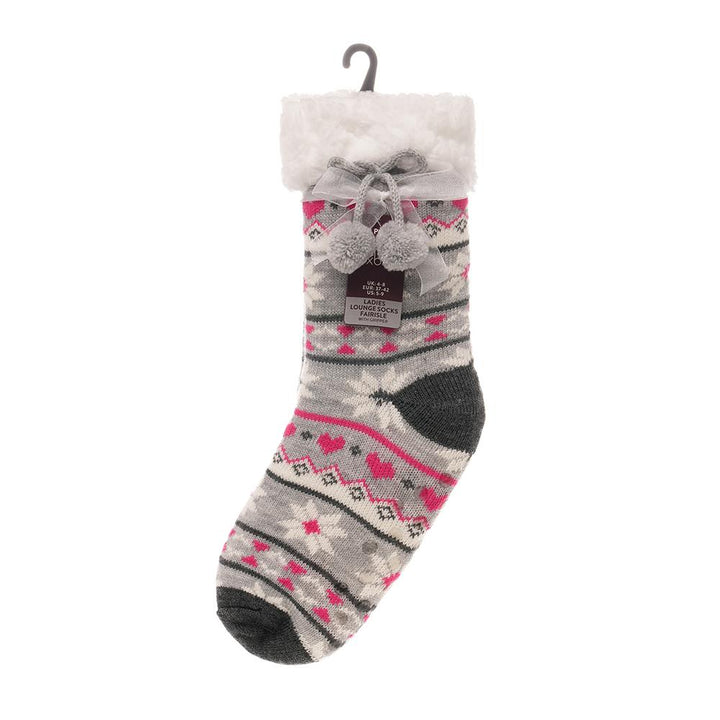 Introducing our Ladies Fair Isle Lounge Socks with Sherpa Fur Lining, where classic style meets unparalleled comfort. These must-have wardrobe staples are designed to elevate your look with effortless sophistication. Crafted for warmth and luxury, the plush Sherpa lining ensures ultimate coziness, while the timeless Fair Isle pattern adds a refined style, these socks provide both comfort and elegance.