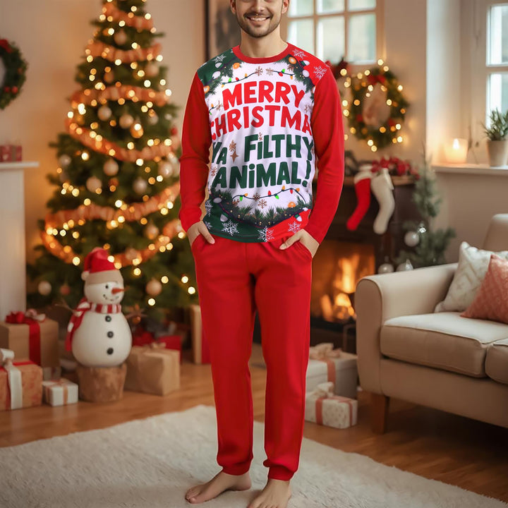 CHRISTMAS THEME: This vibrant Christmas jumper is the perfect choice for men and women looking to spread holiday cheer. Featuring the playful phrase "Merry Christmas Ya Filthy Animal," it showcases the fun and quirky side of the season. With bold colors and detailed designs, it adds a joyful touch to any winter outfit. Ideal for Christmas parties, family gatherings, or relaxing nights by the fire, this jumper brings festive energy and charm to your holiday wardrobe. COMFORT: These Christmas pyjamas are designed to provide the perfect level of warmth throughout the winter months. Not too thick to cause overheating, but just right for chilly nights, they offer soft and breathable comfort. With their fun holiday prints. Your child will stay warm and relaxed, making them the perfect ift to ensure a restful and cheerful night’s sleep during the holidays. HIGH QUALITY MATERIAL: These Christmas pyjamas feature 100% cotton sleeves and a 100% polyester front print, offering softness, durability, and comfort. With vibrant festive designs, these pyjamas keep your child cozy and stylish throughout the holiday season. Perfect for winter nights, they combine warmth and fun! FEATURES: This Christmas loungewear set is designed for ultimate comfort and functionality. The round-neck jacket ensures effortless wear, complete with a cozy hood for added warmth and ribbed cuffs and waistband for a snug, secure fit. The matching red joggers feature an elasticated waistband for a personalized fit, along with ribbed ankle cuffs and sleeves to keep them comfortably in place. Perfect for lounging in festive style! AVAILABLE SIZES: Available in sizes S, M, L, XL, 2XL, 3XL, and 4XL, this Christmas pyjama set ensures a comfortable fit for men and women of all sizes. The two-piece set includes a cosy top and matching bottoms designed to complement every body type while allowing plenty of room for movement. Combining style and comfort, these pyjamas make the perfect holiday gift and a fun, festive way to celebrate the season.
