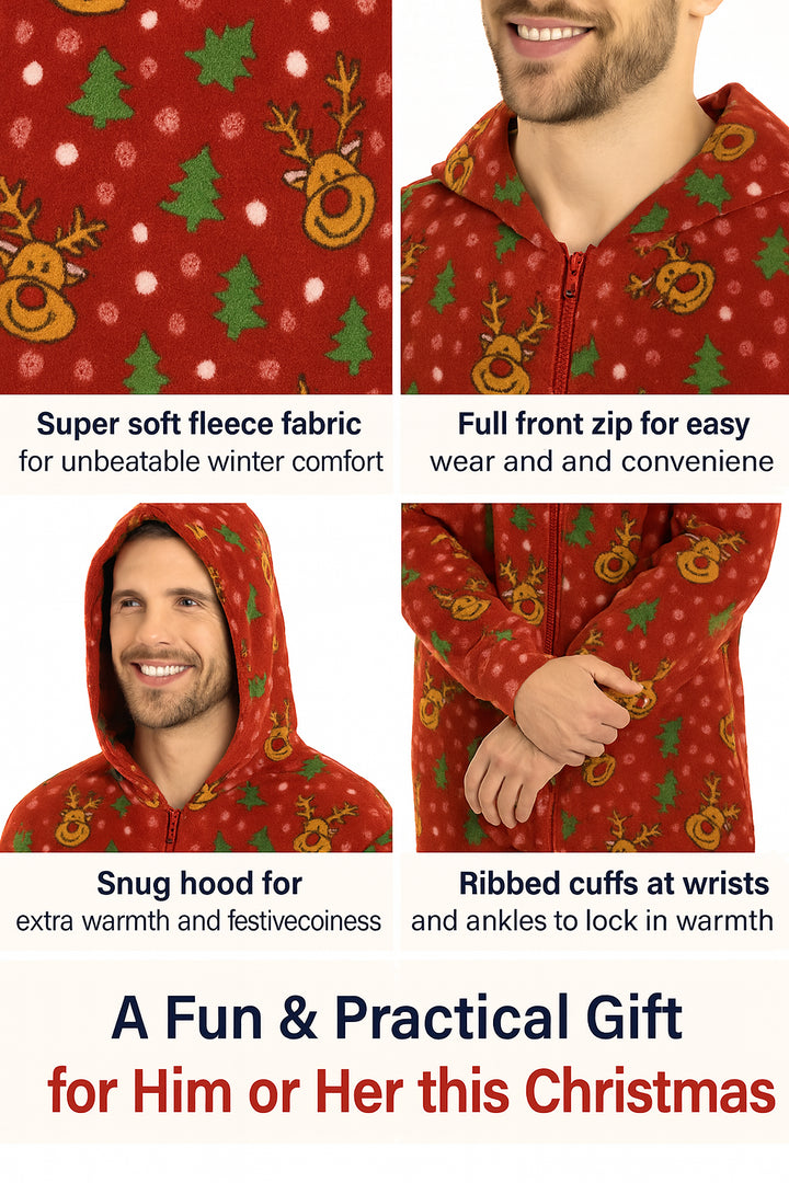 Features a practical front zip for easy dressing and removal, plus a snug hood for extra warmth. Designed for men and women, this all-in-one pyjama combines convenience and style, ensuring you stay cosy while looking festive. -