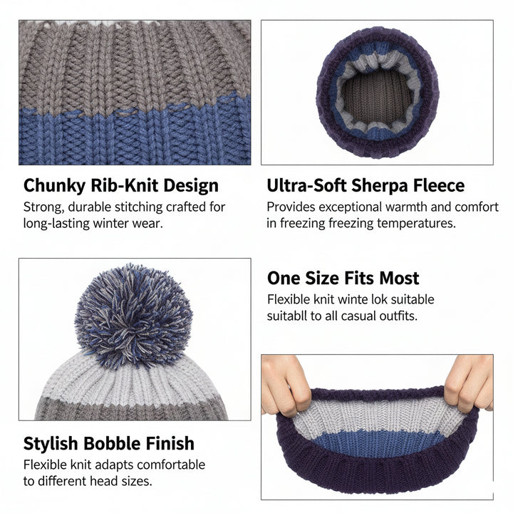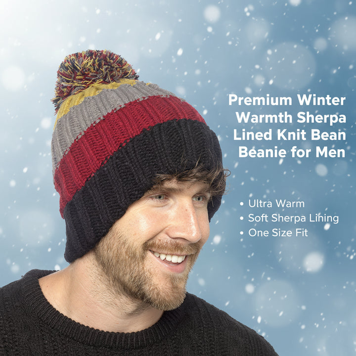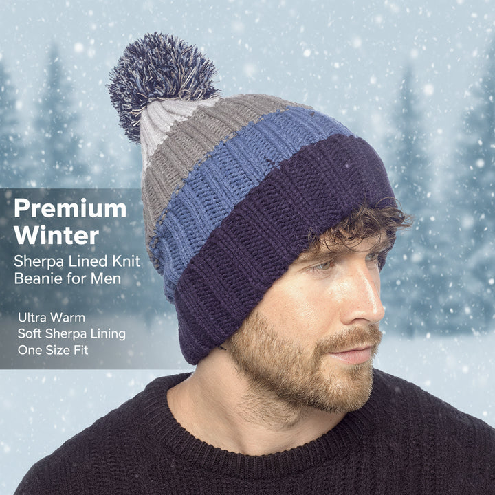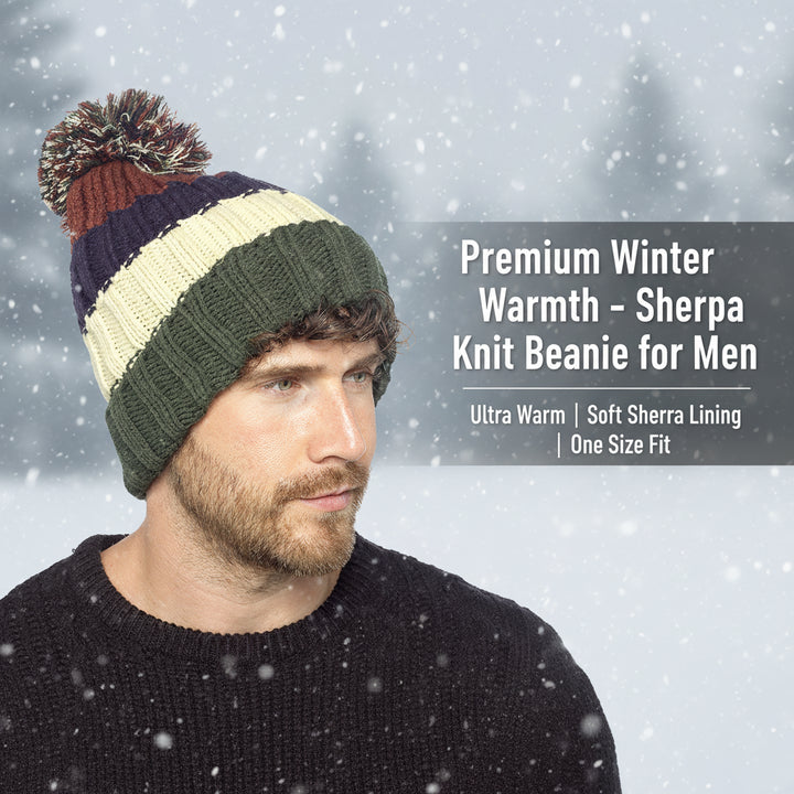 A2Z Mens Knitted Stripe Beanie Hat With Warm Sherpa Lining Chunky Knit Beanie