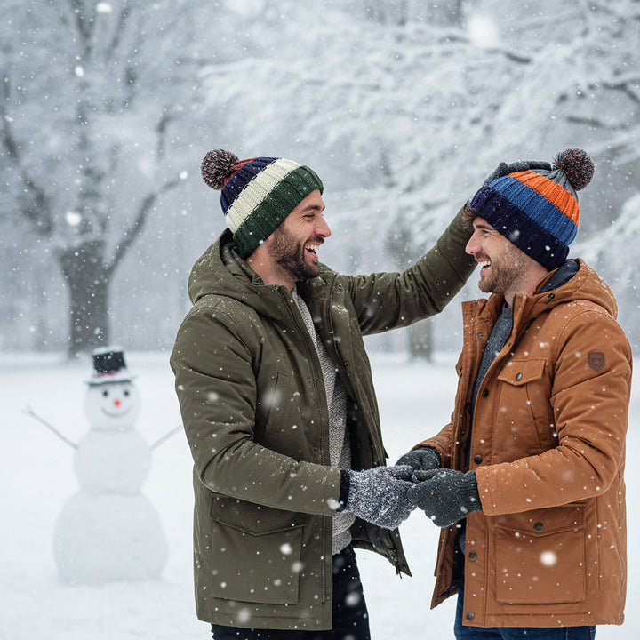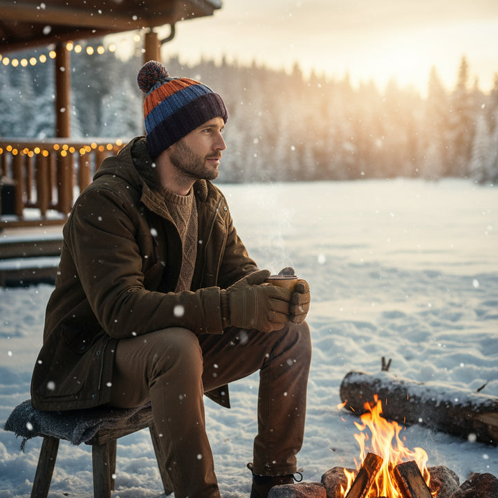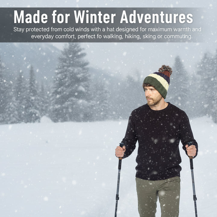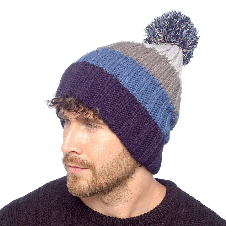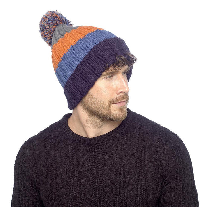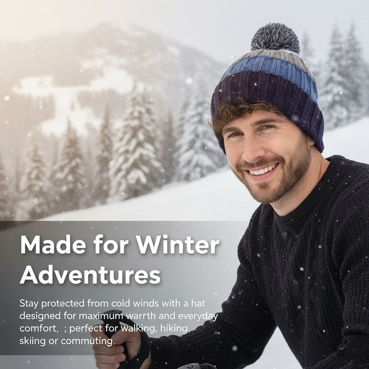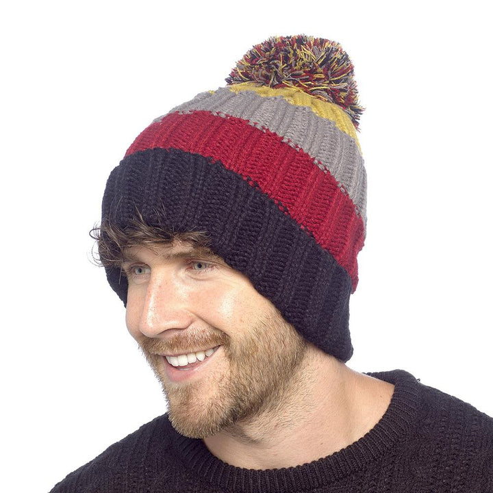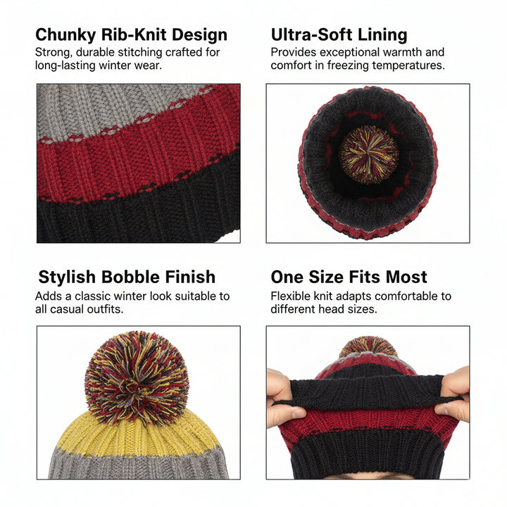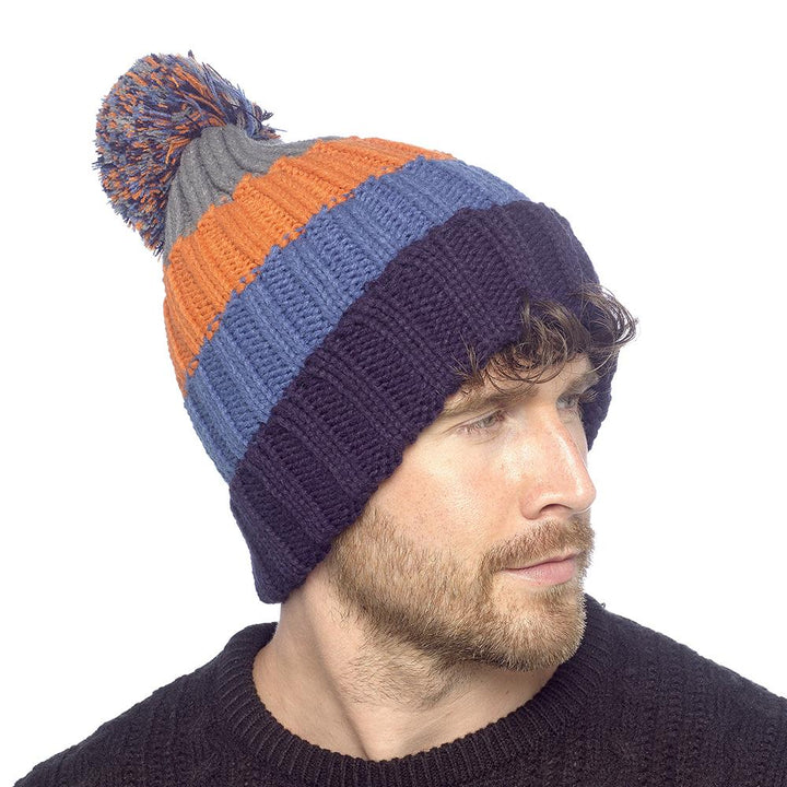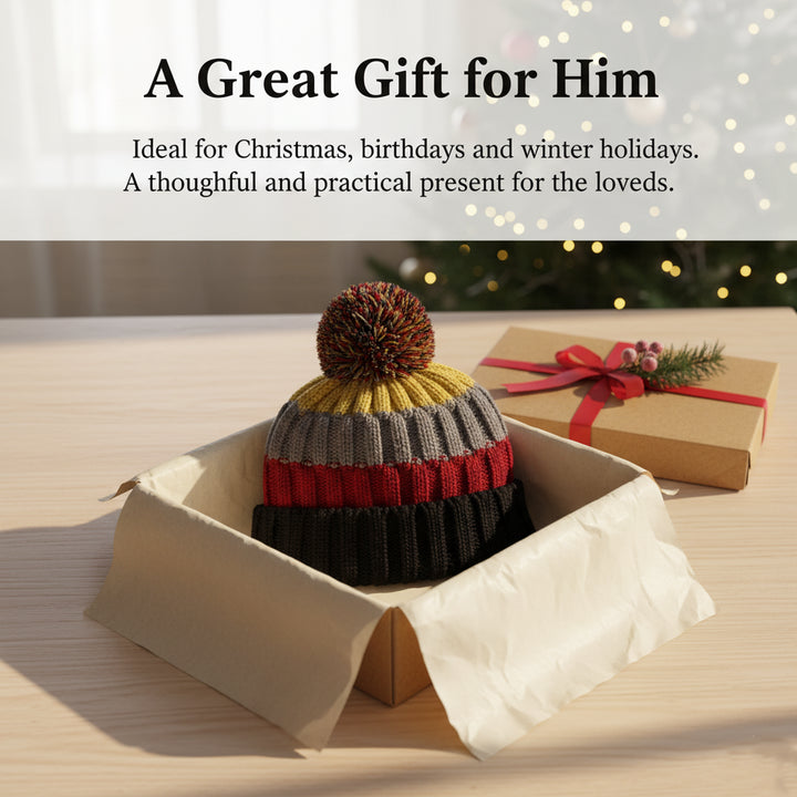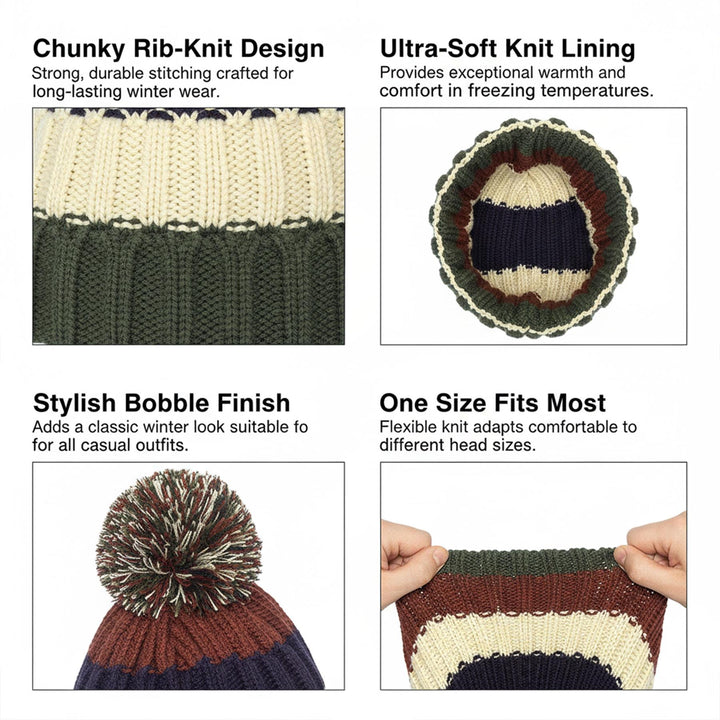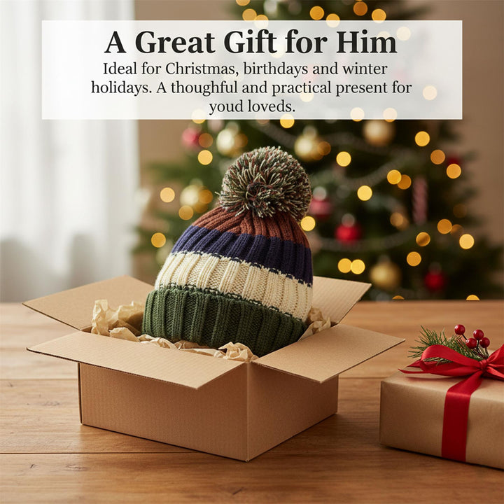 This mens striped beanie offers a timeless winter look with bold multi-colour stripes and a fun bobble top, perfect for daily wear, commuting or outdoor adventures. Its classic rib-knit design ensures lasting durability and a snug, cosy feel, making it an ideal accessory for cold weather outfits.