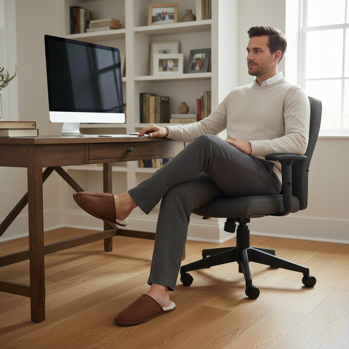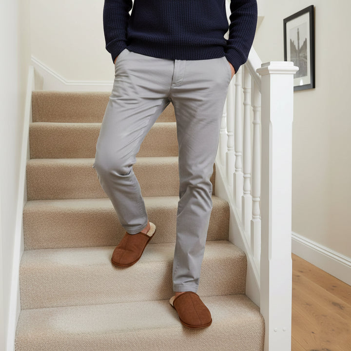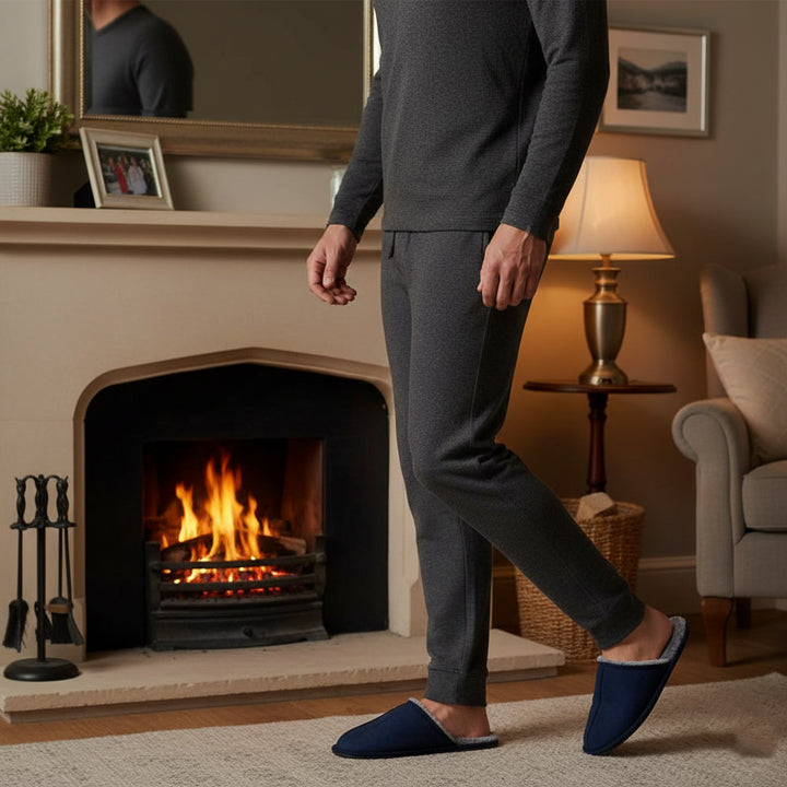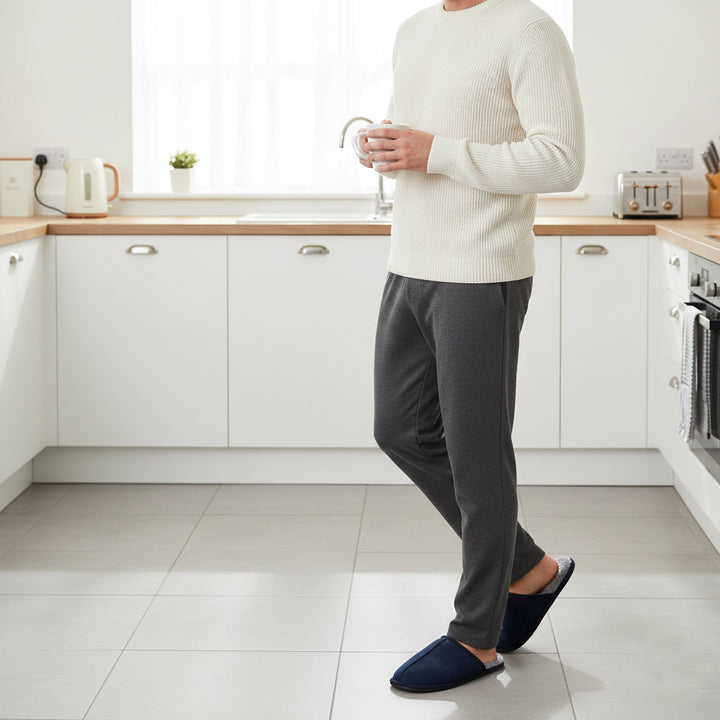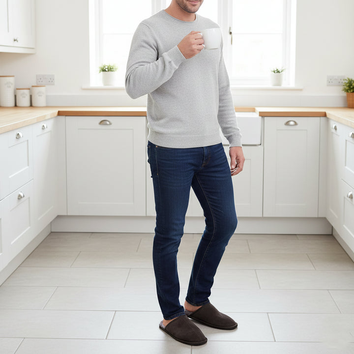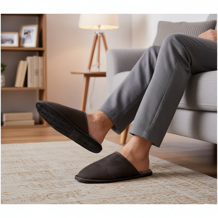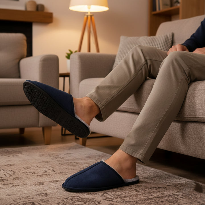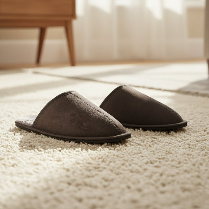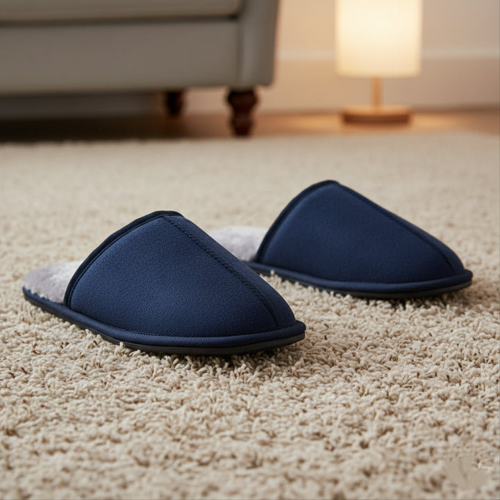 Embrace layers of warmth and comfort with these refined slippers featuring a plush quilted upper. Tailored for indoor use, these slippers seamlessly blend style and comfort. The sophisticated plain pattern in shades of grey and navy offers a compelling and fashionable choice for men seeking to infuse a sense of adventure into their daily attire.