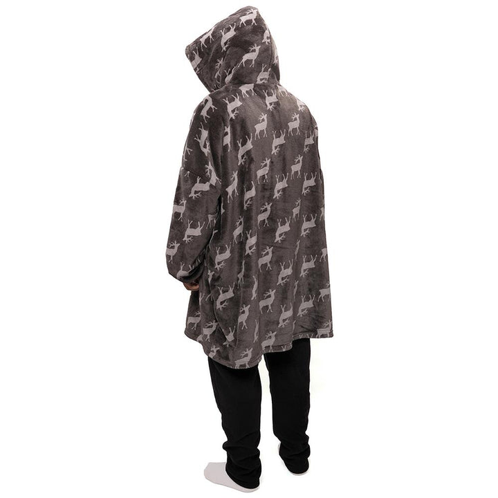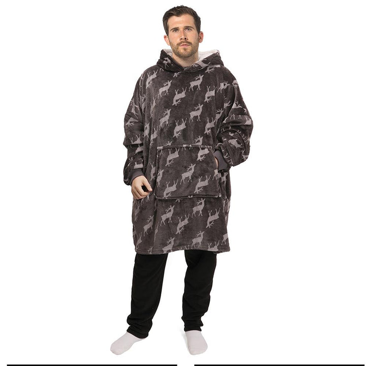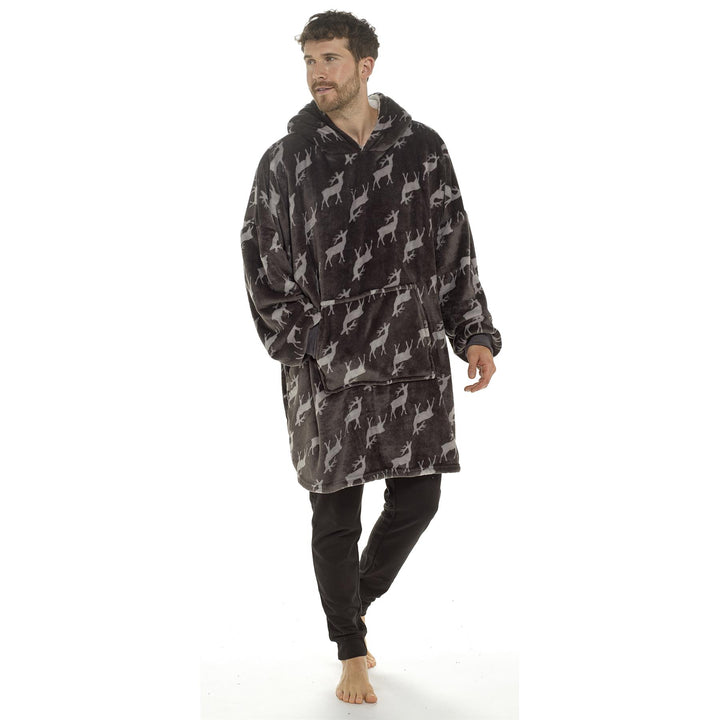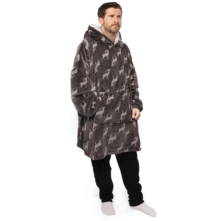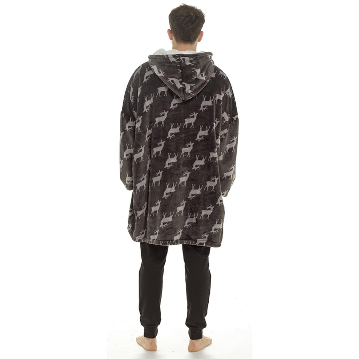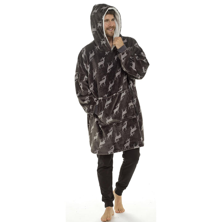 A2Z Mens Oversized Snuggle Hoodie Sherpa Lined Stag Print One Size Grey