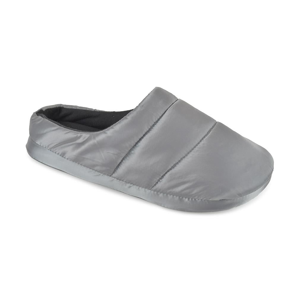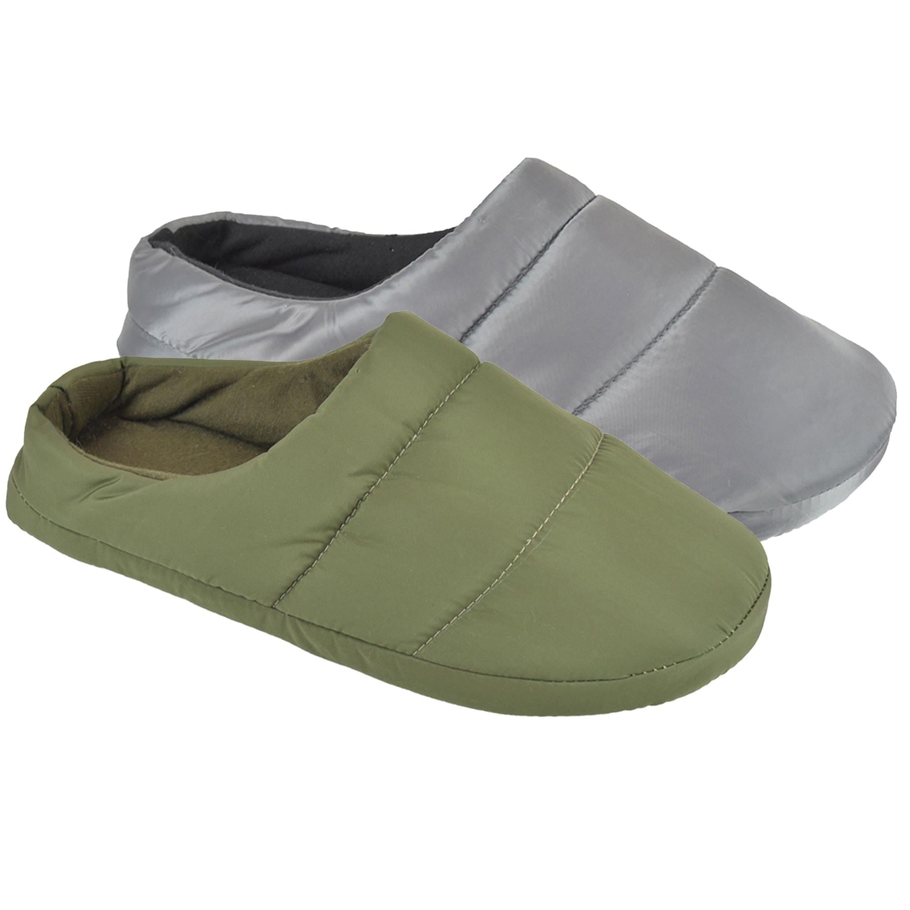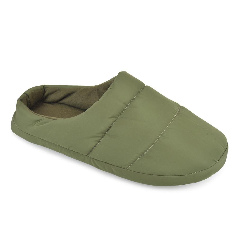 These quilted puffer slippers, lined with fleece for added warmth and comfort, are available in Grey and Khaki. Sizes range as follows: 7-8 UK, 9-10 UK, and 11-12 UK