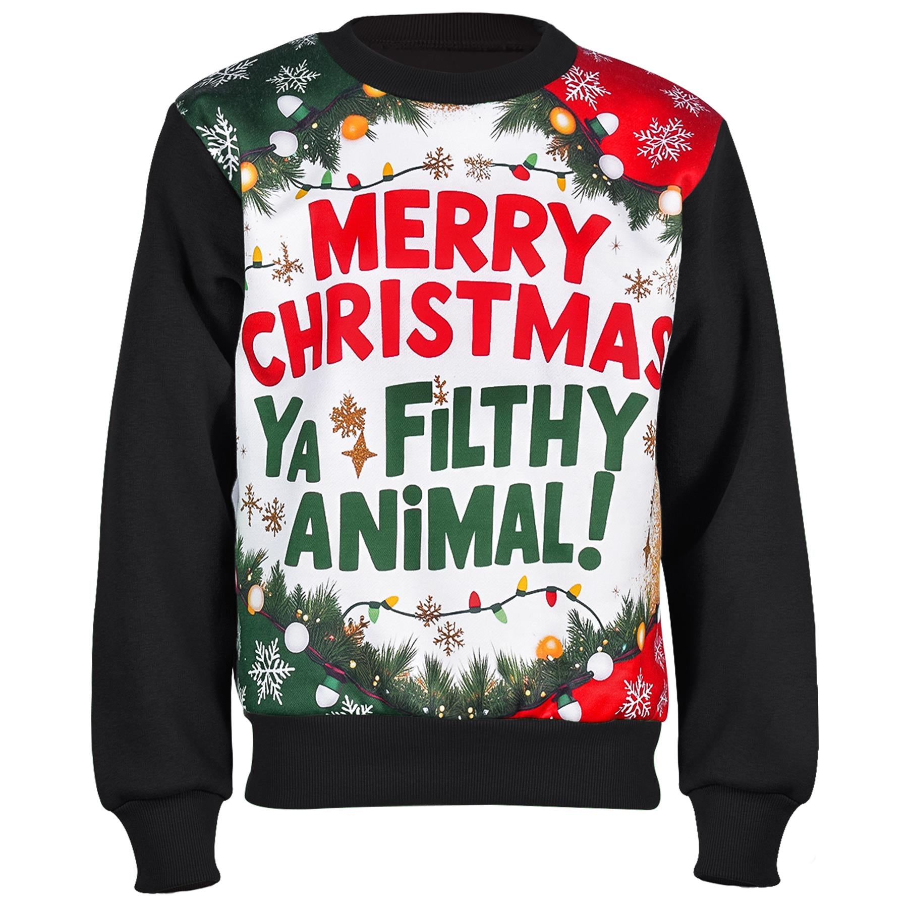 This jumper features a classic round neck suitable for various face shapes. The fun ya Filthy Jumper design is simple and exciting, and the loose-fitting style allows you to be fashionable while maintaining a casual look. The intricate and vivid print pattern adds a touch of fashion, ensuring that you will stand out at the Christmas festival. -
