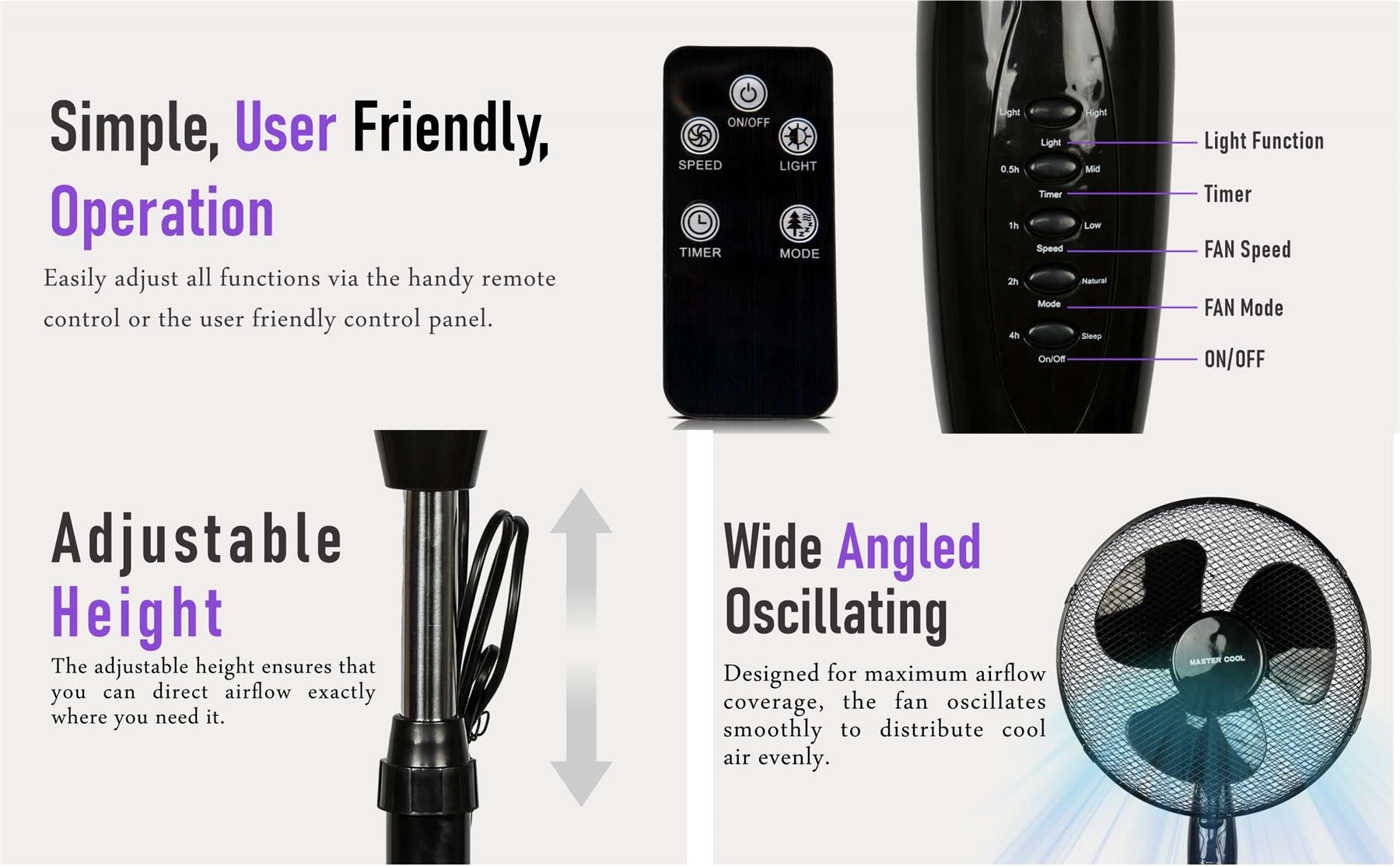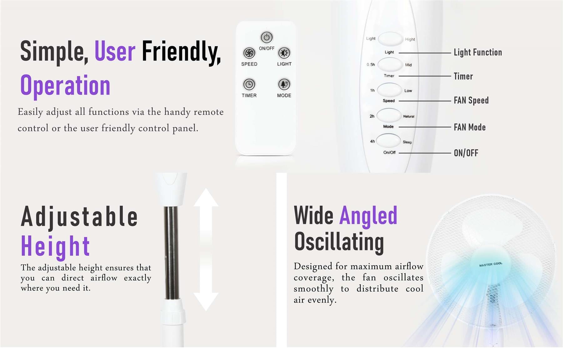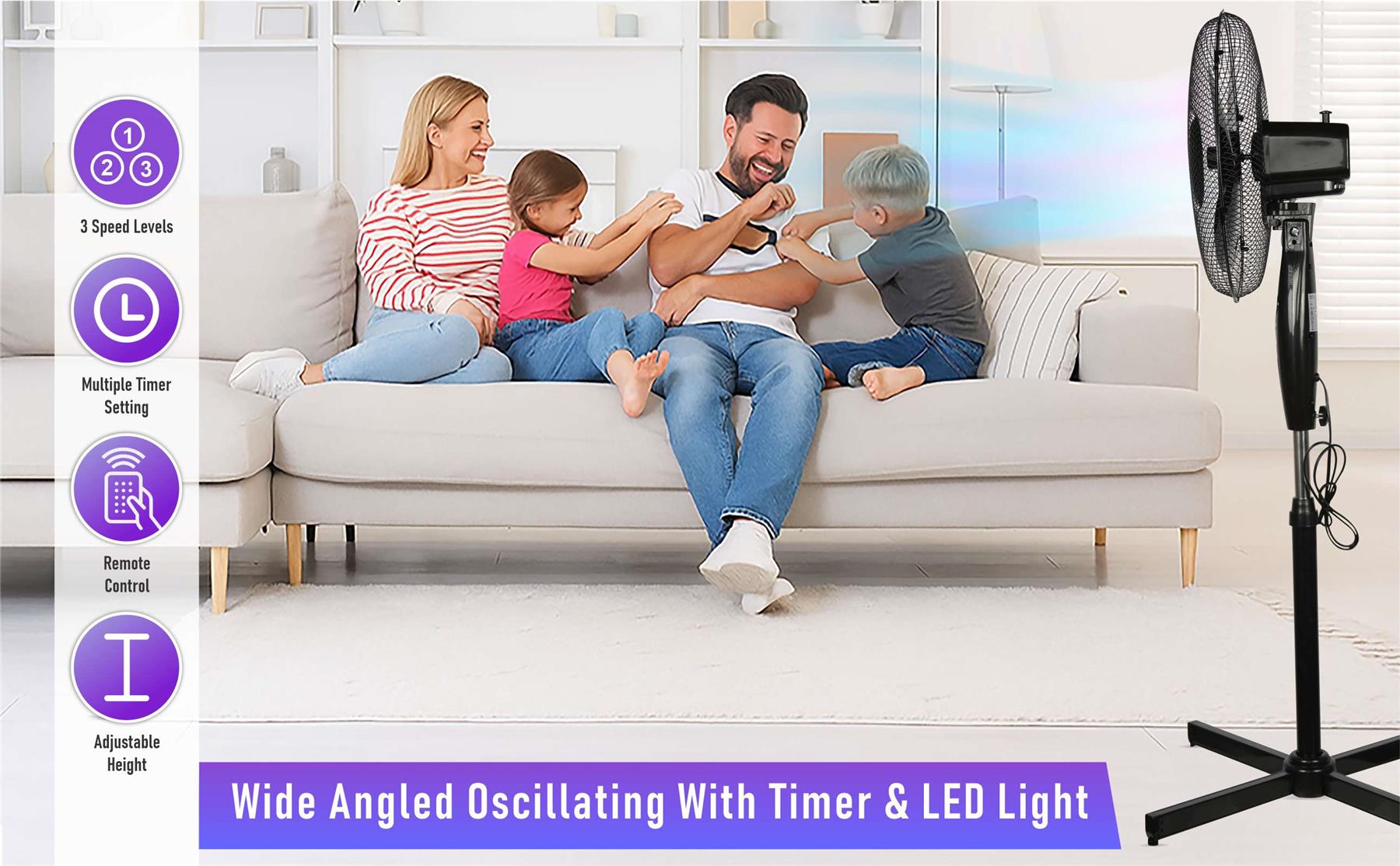 Designed for maximum airflow coverage, the fan oscillates smoothly to distribute cool air evenly. The adjustable height ensures that you can direct airflow exactly where you need it. -