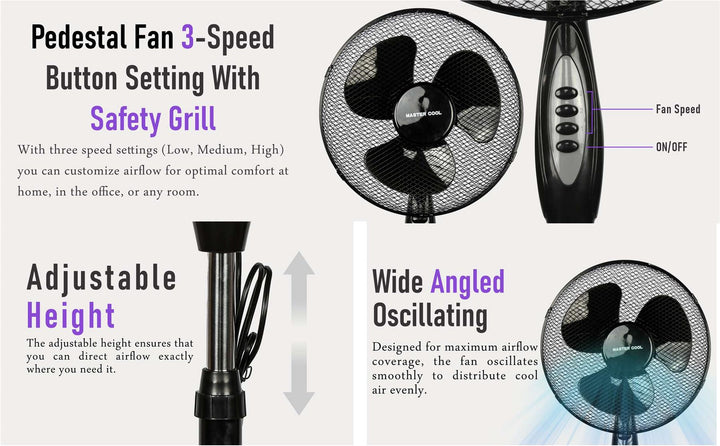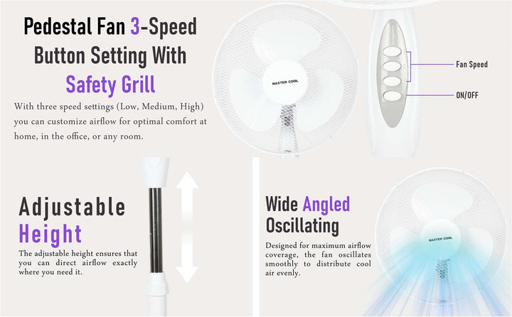 Stay cool with the 16-inch pedestal fan, designed for strong airflow to refresh any space. With three speed settings (Low, Medium, High), you can customize airflow for optimal comfort at home, in the office, or any room.