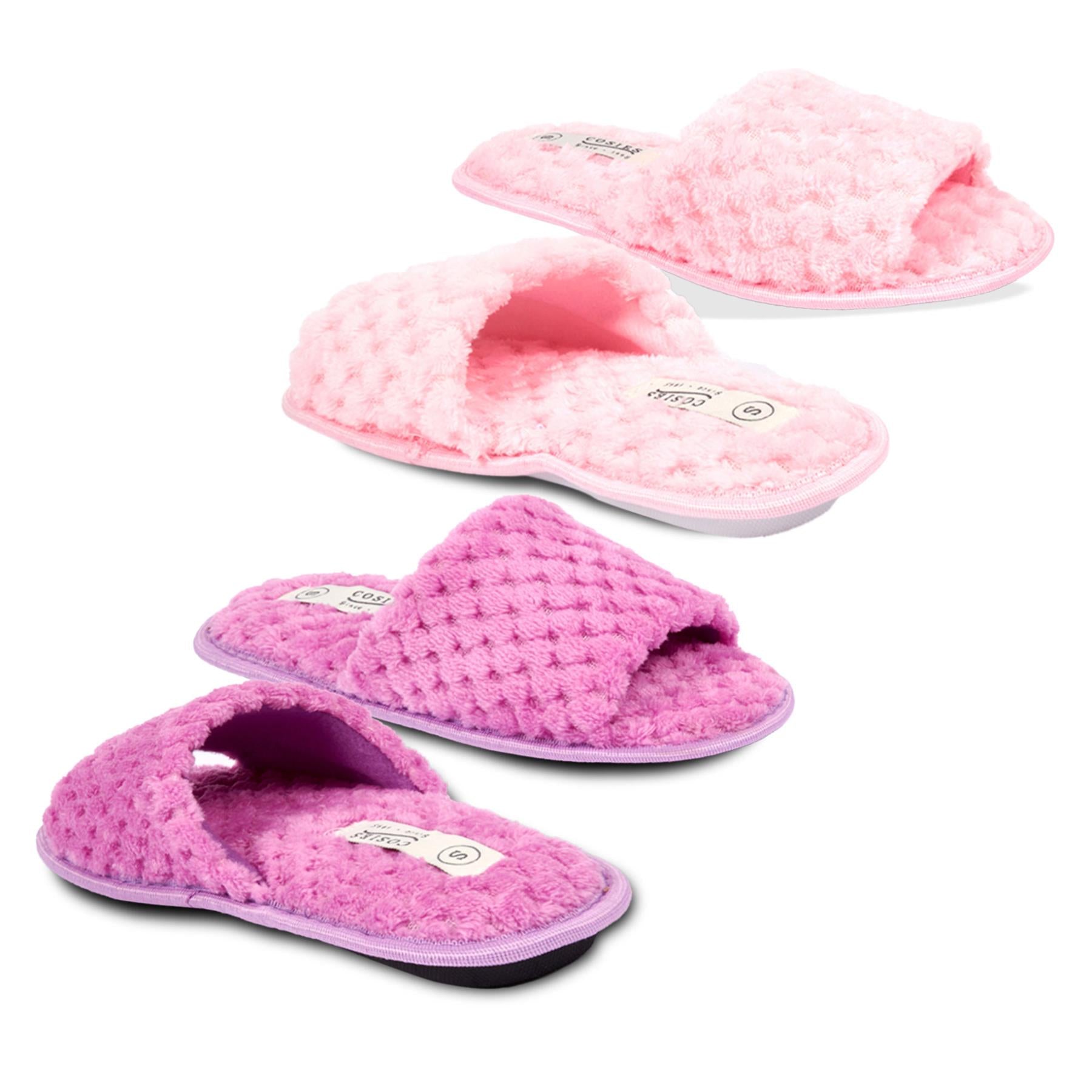 These fluffy slide slippers come in Lilac and Pink, with available sizes of 3/4 UK, 5/6 UK, and 7/8 UK.