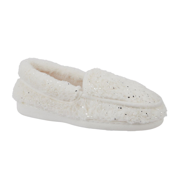 These glamorous womens slippers are crafted from vegan-friendly sparkle fur and lined with soft fabric. Designed as slip-on moccasin-style slippers, they seamlessly blend exceptional comfort with effortless style and chic appeal.